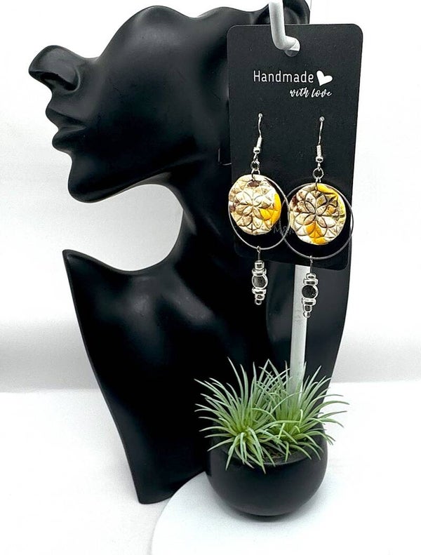 In silver tone, circle bezel with yellow and brown quilt desing polymer clay earrings and silver bead dangles.