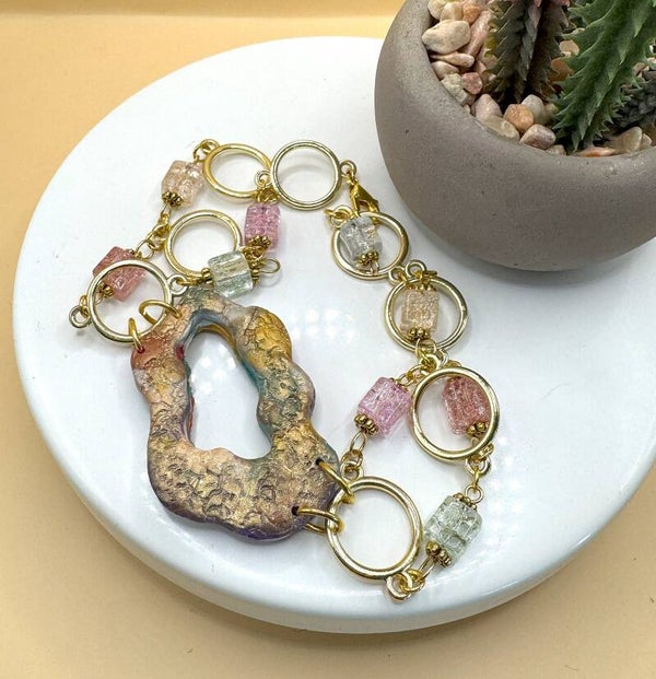 Gold Tone bracelet with crystal links and a nugget shape polymer clay multi-color center. Fits 7 to 9-inch wrist.