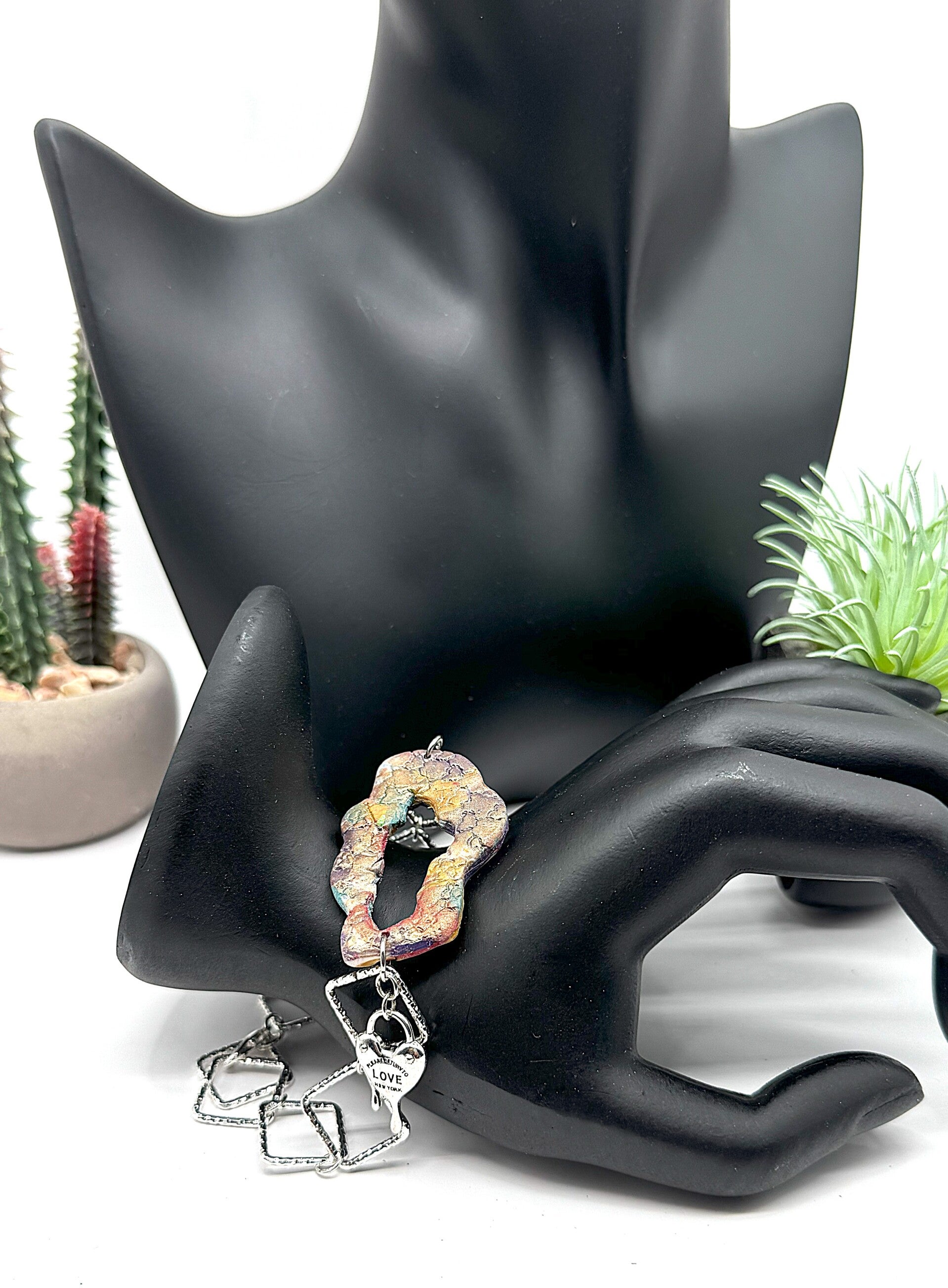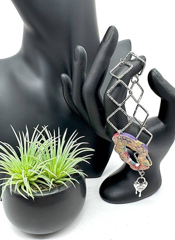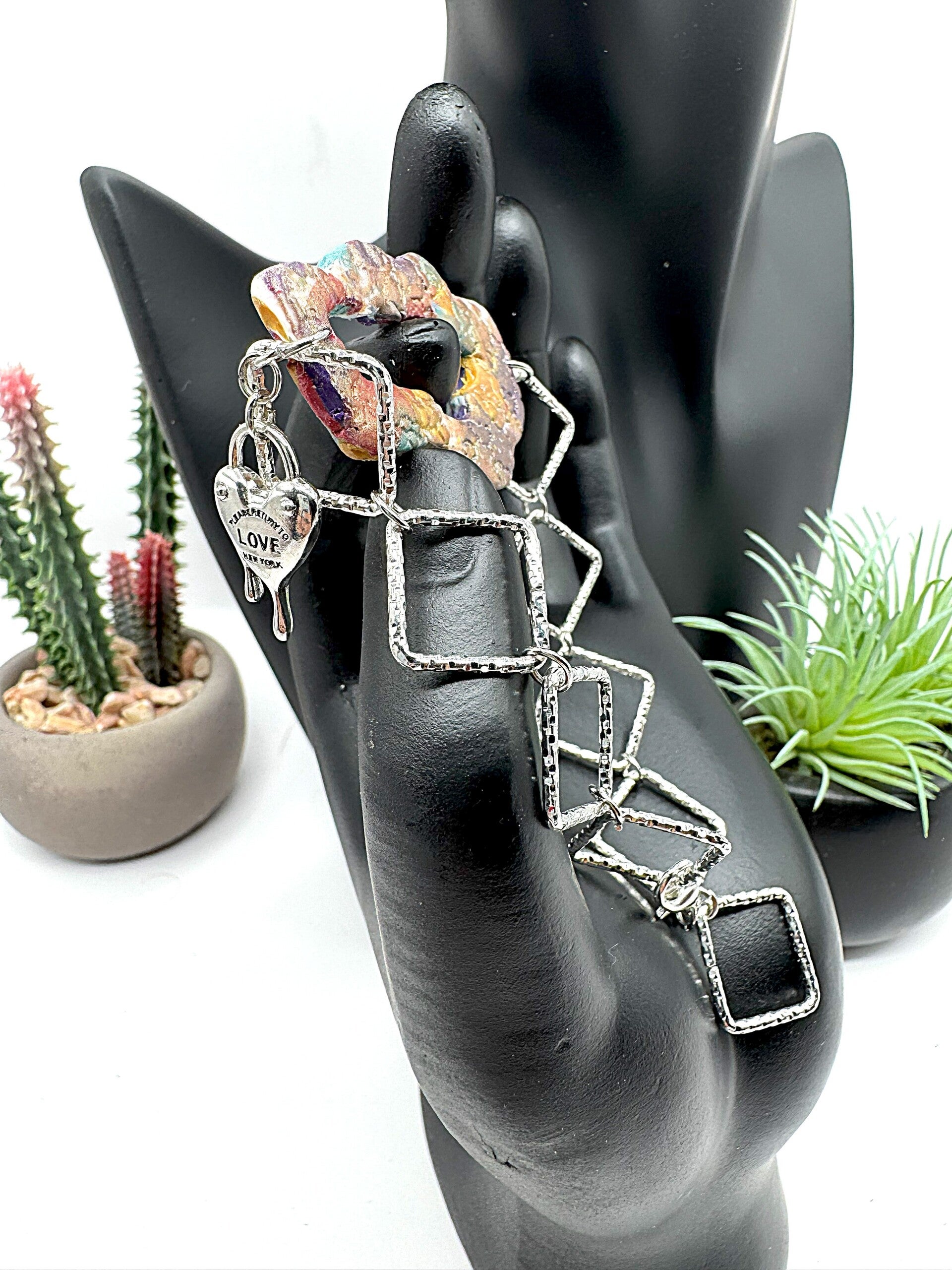 In Silver tone, diamond-shaped links bracelet with a multi-color polymer clay nugget in the center and a heart charm. Fits 7-9 inch wrist.