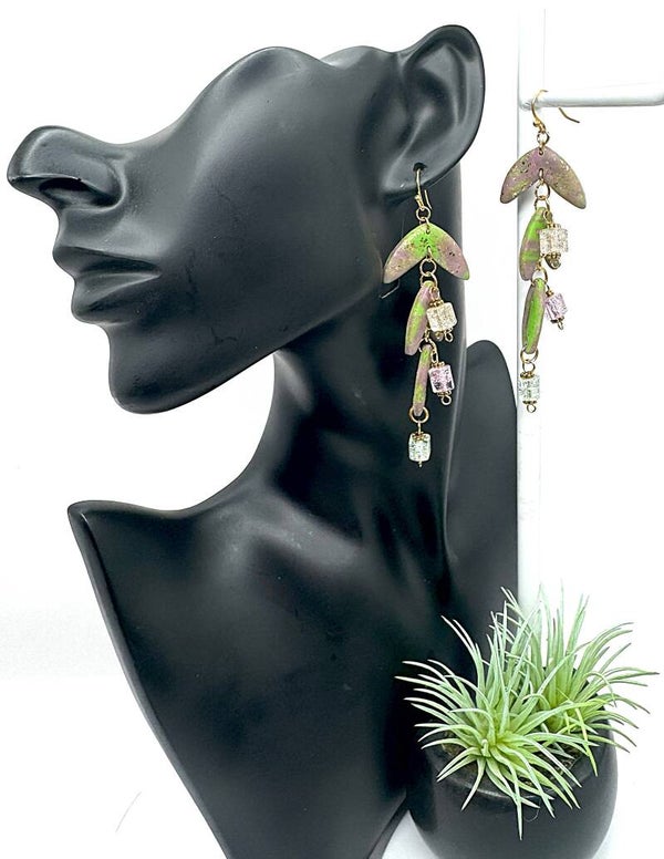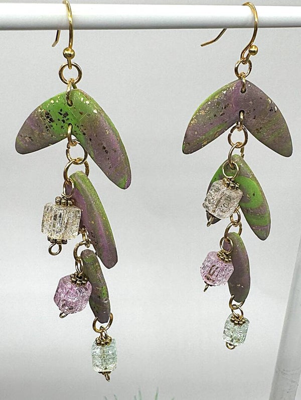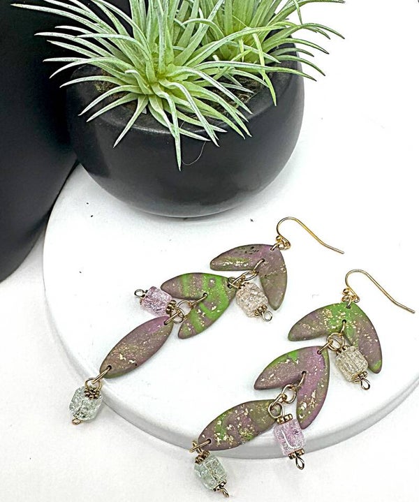 In gold tone three-layer dangle polymer clay earrings in mauve & green color combination. Enhanced with crystal beads.