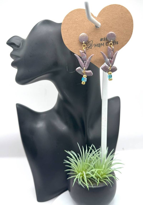 In gold tone, tulip shaped polymer clay earrings with blue crystal charm. Polymer clay color include gold, purple, and blue color combination.
