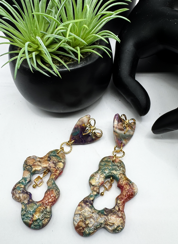 The combination of green, gold, orange, blue, and purple reminds me of the beautiful nuggets inside a cave. This spectacular array of colors, crafted from polymer clay, makes this piece truly one-of-a-kind for your collection. It is enhanced with a heart-shaped connector, gold-tone hardware, and bow post-back earrings. Pair this up with any solid color tops or dress, and wallah! Despite its large size, it is lightweight and comfortable to wear.