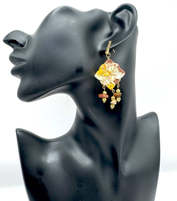 In gold tone, yellow, brown, and beige quilt pattern earrings with three natural stone charms.
