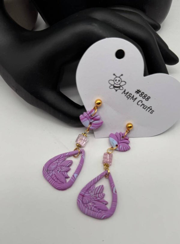 In gold tone, pink & blue polymer clay Lotus earrings with pink crystal charms.