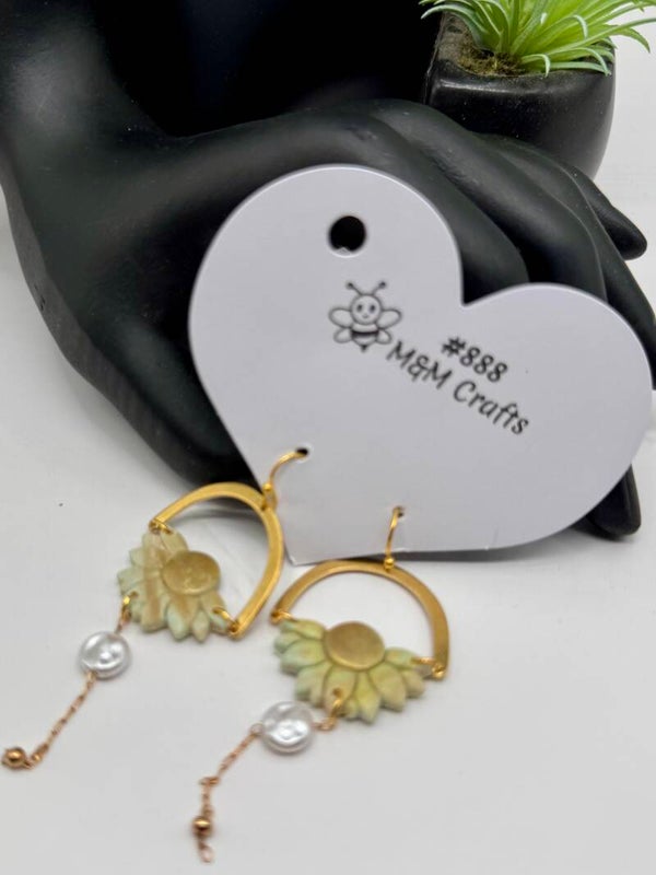 In gold tone, light green with gold flecks half daisy flower with half moon bezel setting. Enhanced with a flat pearl charm.