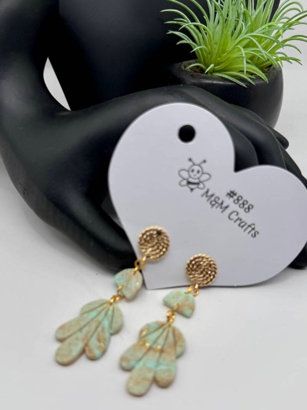 In gold tone, green, and beige flecked gold polymer clay half moon with leaf earrings. Enhanced with a spiral rope post.