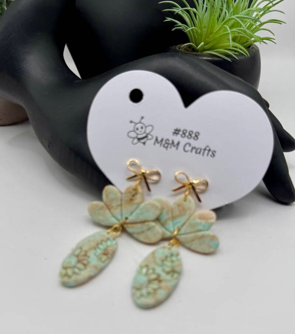 In gold tone, featuring light green with beige and gold fan flower details, these polymer clay earrings are set with a bow post.