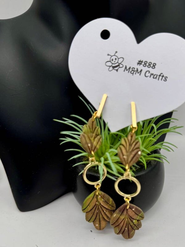 Set in gold-tone hardware, double-leaf polymer clay in brown, green and gold earrings with a circle connector.