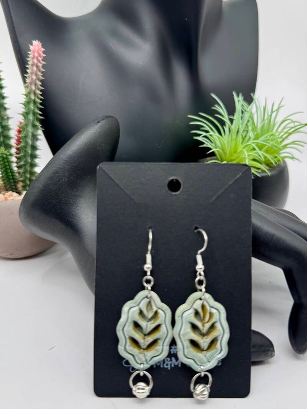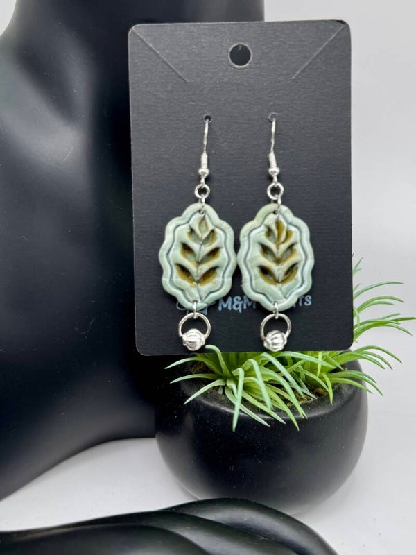 Set in silver tone, scrolled oval teal polymer clay earrings with leaf stamp and silver bead charm.