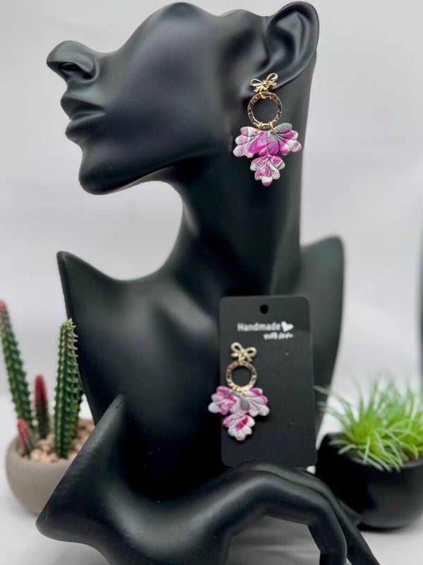 Set in gold tone hardware, pink, gray & white leaf design in polymer clay with hammered circle connector, and bow stud.
