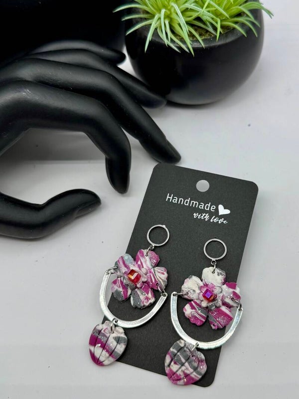 Set in silver tone hardware, pink, gray & white polymer clay flower with crystal center in upside down arch decsign connector.