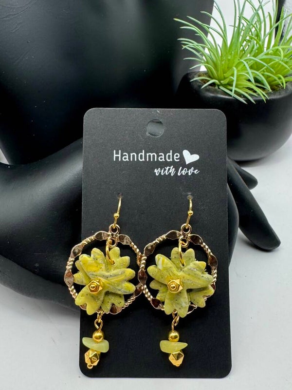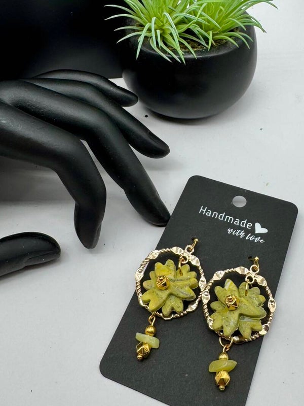 Set with rose gold tone hardware, green polymer clay 3-D flower in bexeled octagon shape ring with natural green stone and gold bead charms.