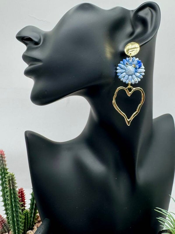 Set with gold hardare, blue and white with gold flecks polymer clay daisy flower earrings with large heart connectors. Beautiful and unique peace sure to get compliments.