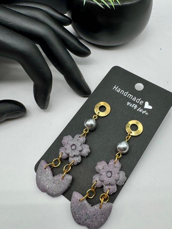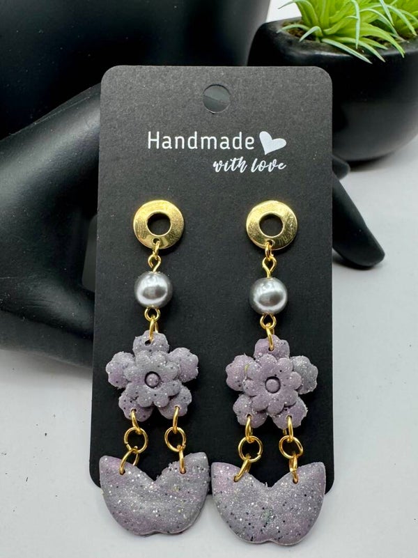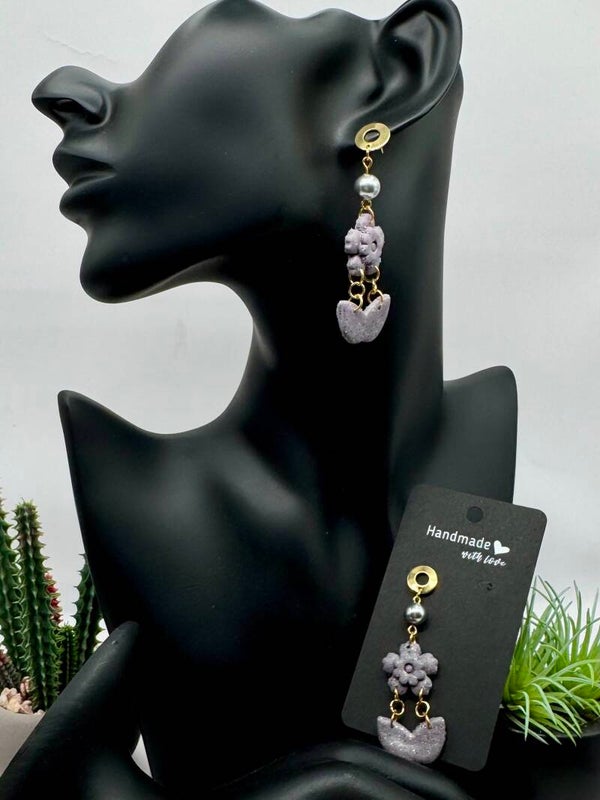 Set with gold tone hardware a flower with leaves earrings in gray & violet polymer clay. Close up it looks like it's made of stone; such a unique color I just cant get enough of. Enhanced with gray pearl beads.
