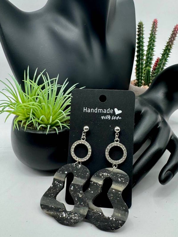 Set in silver tone with rhinestone circle connector, silver and black polymer clay boho earrings.
