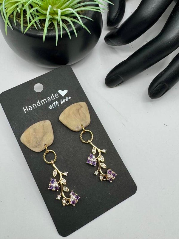 Set in gold tone hardware, polyment post in marble beige with purple and clear rhinestone floral earrings.
