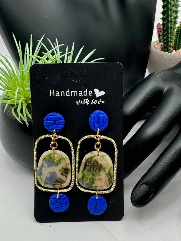 Set in gold-tone hardware, these royal blue polymer clay post-back earrings showcase a gold frame with a picture design. They are symmetrically balanced with another royal blue brick-patterned circle. This design draws inspiration from a Japanese painting I once admired. Another unique, one-of-a-kind piece to add to your collection.