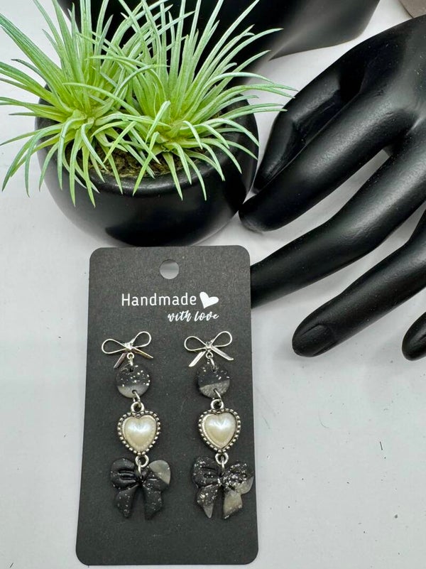 Featuring silver-tone hardware, polymer clay in black and gray with silver flecks accents the bezeled heart-shaped frame, complete with a pearl bead. Finished with a bow post back, it’s both elegant and classy, yet effortlessly complements a casual outfit.