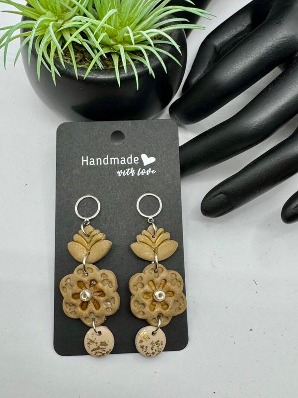 Set in silver-tone hardware, these polymer clay earrings feature a charming olive and brown-toned flower and leaf design with open circle post backs. Picture them paired with a cream-colored sweater and comfy jeans—it’s the perfect fall look.