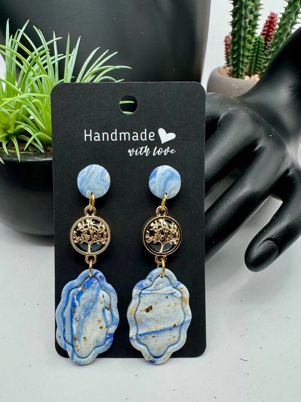 Inspired by the comfort of denim, these earrings showcase a blend of blue, white, and gold polymer clay, paired with round post backs accented by a blue tree of life design connector. The blue backdrop of the tree of life glimmers beautifully in the sunlight.
