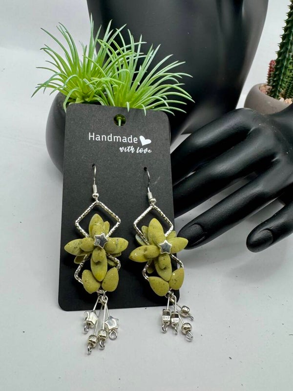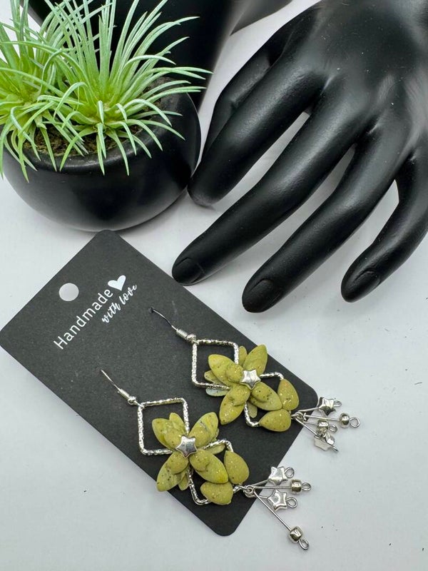 A playful pair of earrings crafted with silver-tone hardware, featuring a triangular backdrop adorned with a green free-form flower. The polymer clay showcases a vibrant green and gray color combination, making it a delightful way to express your unique style.