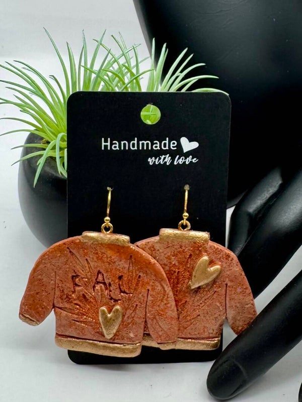Too cute not to share! These earrings feature gold-tone hardware, orange and gold polymer clay, and handwritten "Fall" details with a free-formed heart enhancement. They're larger in size but still lightweight, making them perfect for fall. Absolutely adorable!