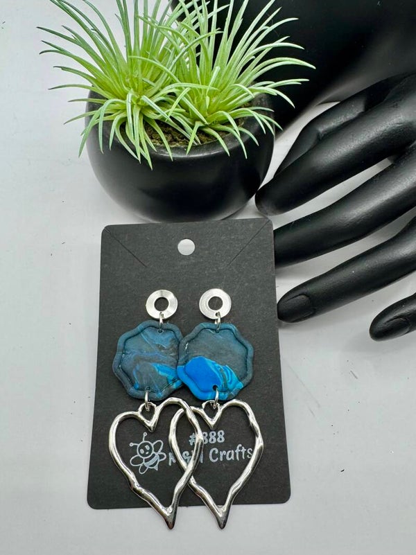 Silver-tone open heart freeform dangle earrings featuring polymer clay accents in a blue, black, and gray color combination.