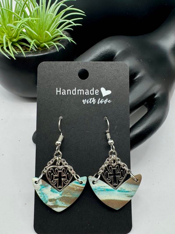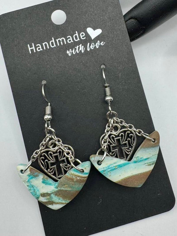 In a silver tone, a cross nestled inside a heart pairs beautifully with a polymer clay heart shape, featuring ocean-inspired hues of blue, teal, brown, and gray. It's a meaningful piece that symbolizes faith, love, and the profound significance of water.