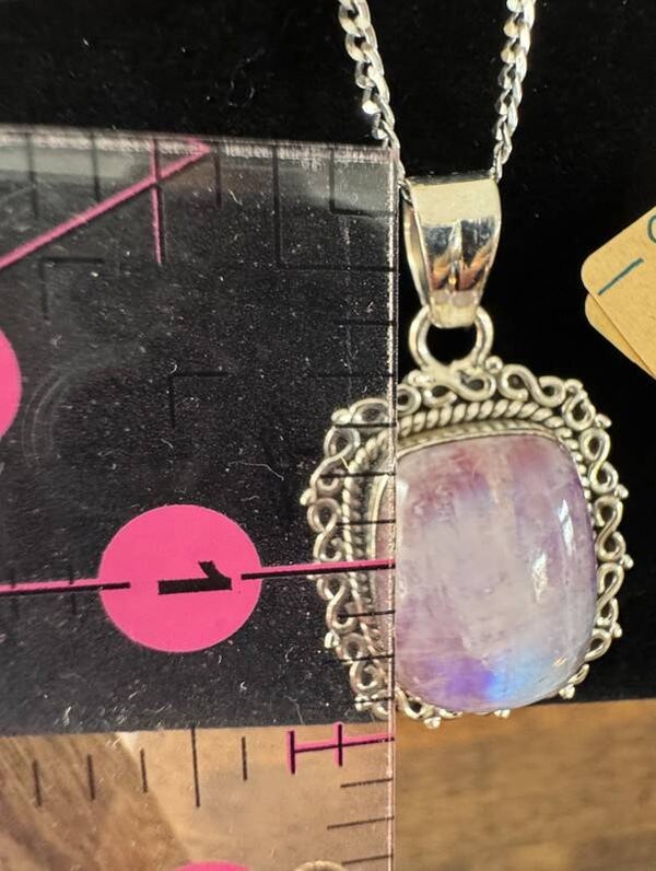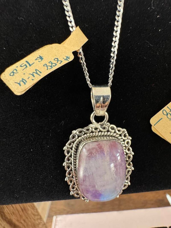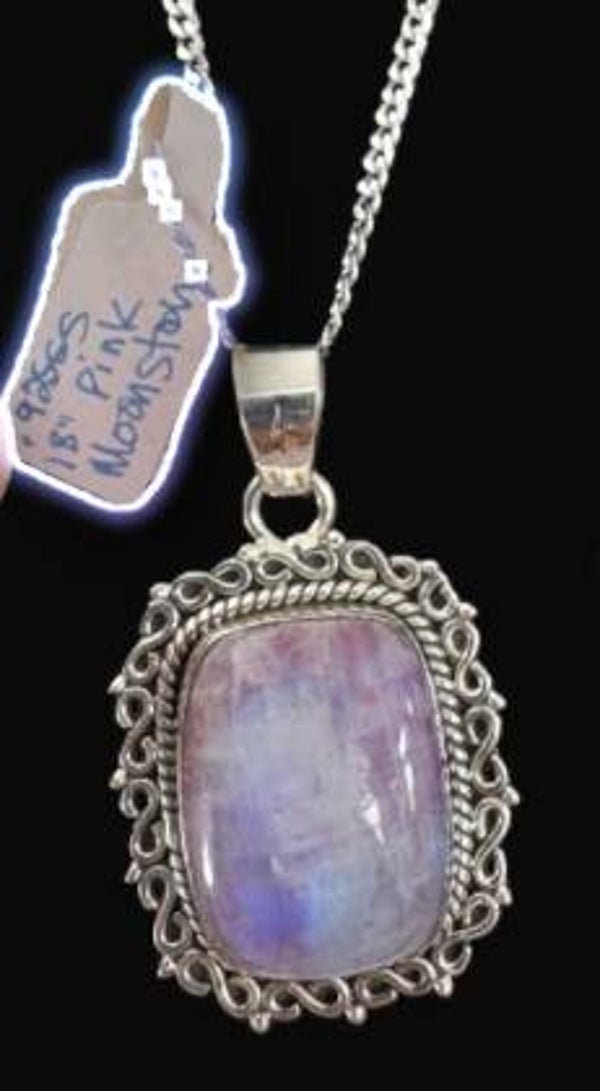 Scroll design setting with an 18 inch rolo chain in .925 Sterling Silver is a large cabochon pink Moonstone pendant. The stone is absolutely stunning as it changes color when it hits the light.