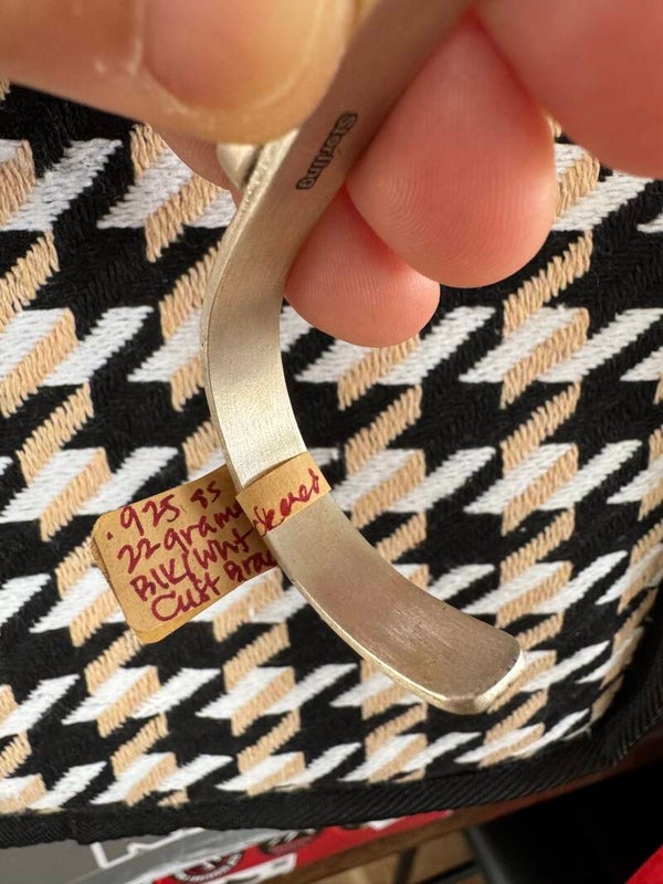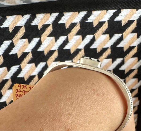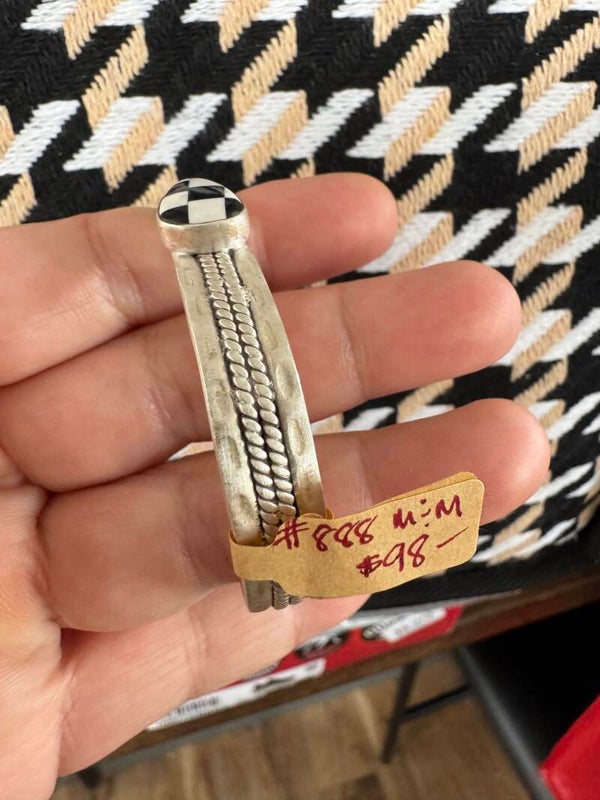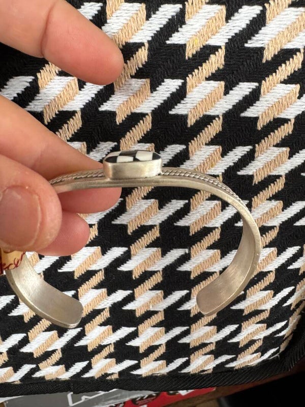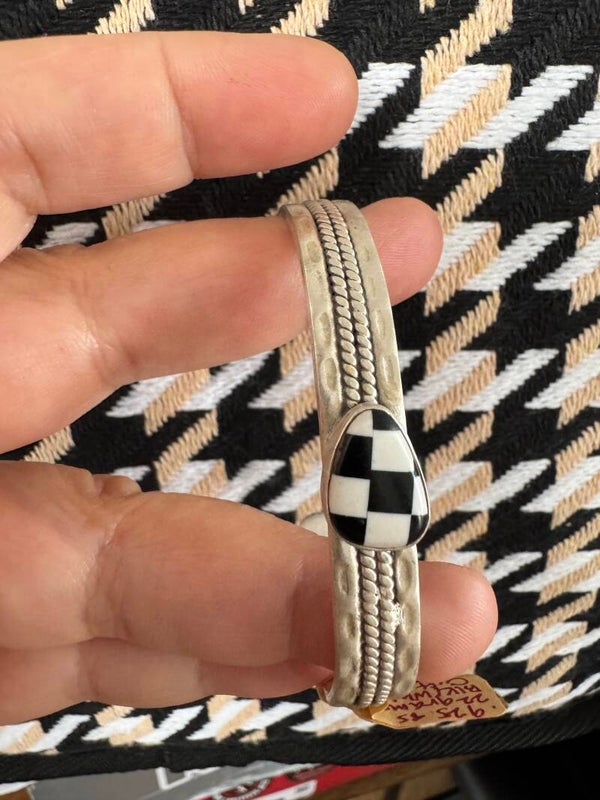 22 grams of .925 Sterling Silver cuff bracelet with black & white checkered stone at the center. Fits size 6-9.
