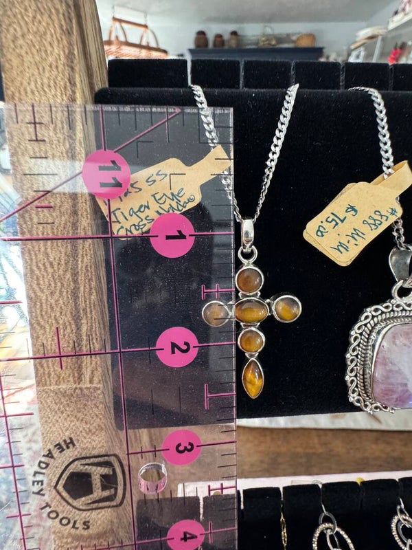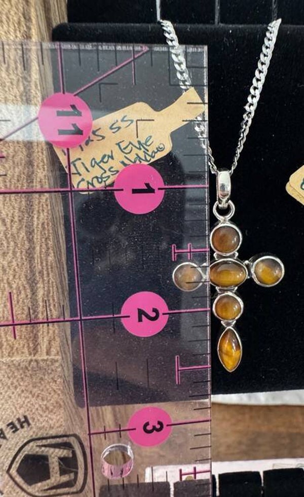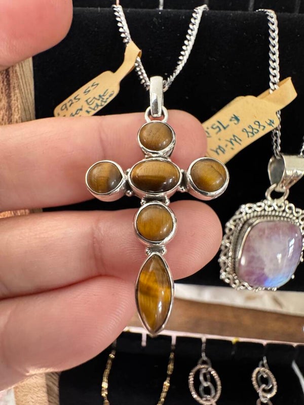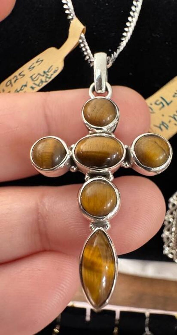 In .925 Sterling Silver, tiger eye stones set in a beautiful Cross pendant with an 18 inch rolo chain.