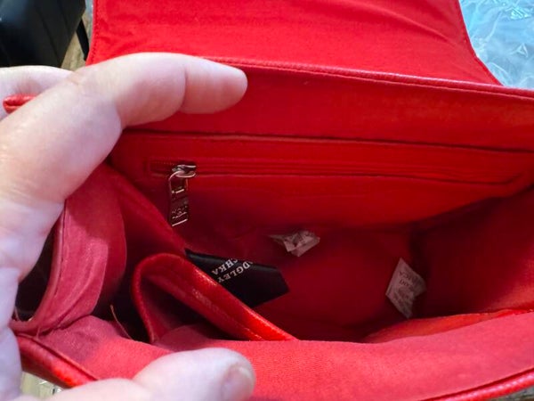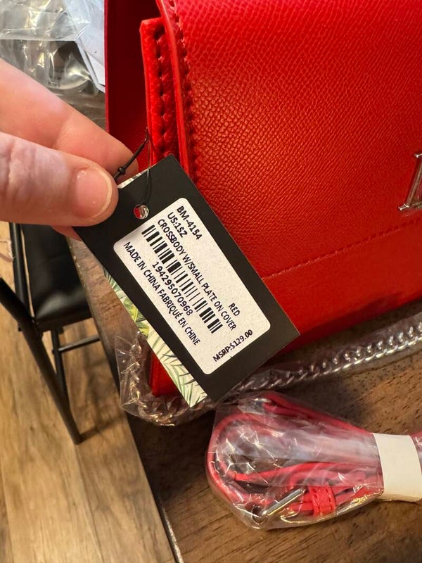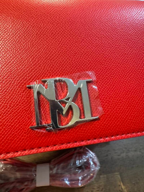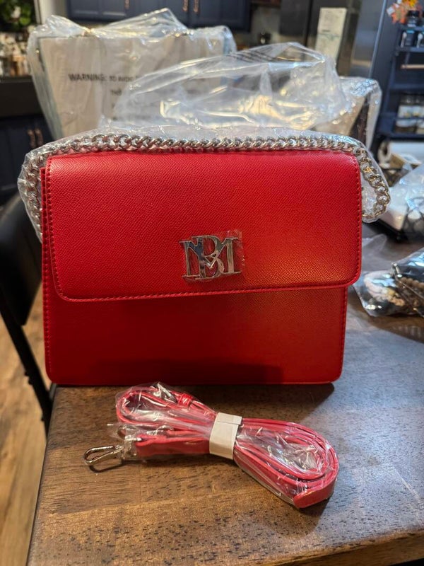 Just in time for the holidays, a RED Badgley Mischka Crossbody Shoulder Bag with 2 detachable straps, a chain shoulder strap and a crossbody strap. Stunning with silver hardware and logo. Faux leather bag has a magnetic closure, and interior storage compartments. L x 3.5\W x 7.5.