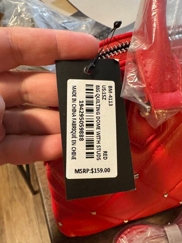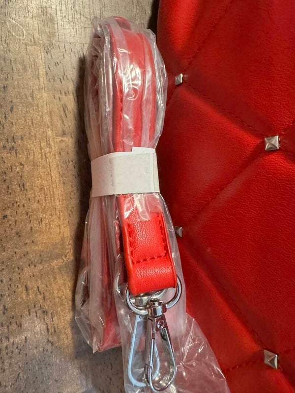 Red with silver hardware is the mini-dome shaped crossbody handbag with handles. Quilted design with studs takes this bag to another level of sophistication. Roomy enough to hold all the necessities but small enough for comfort and convenience. Truly a great addition to your wardrobe.