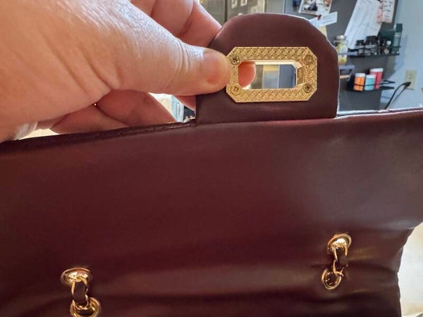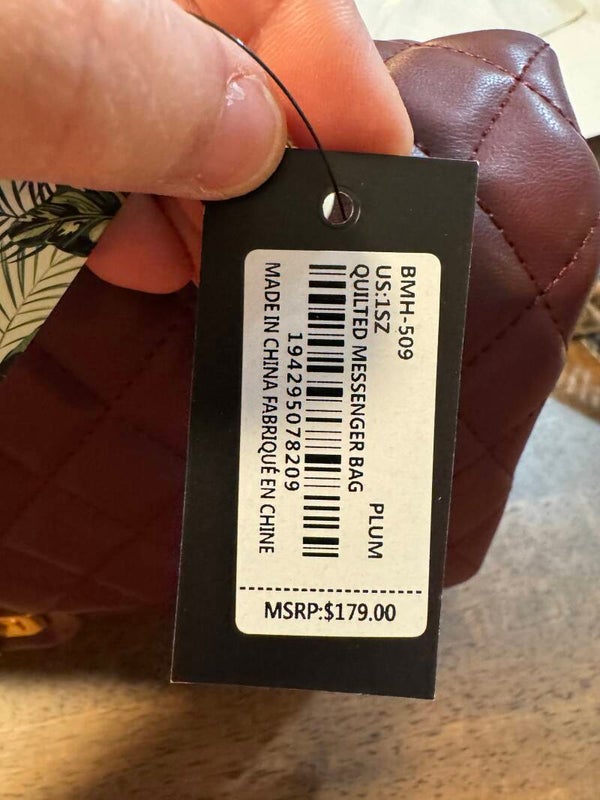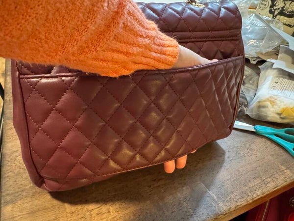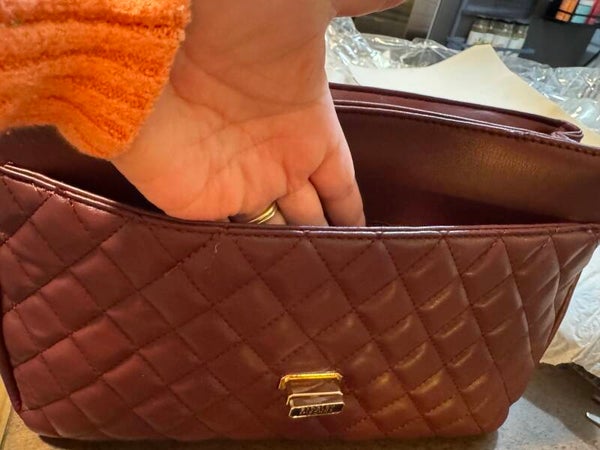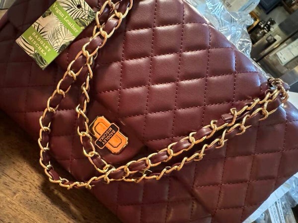Crafted for the modern woman, this Burgundy Vegan Leather Badgley Mischka Messenger Bag combines sophistication with practicality. The quilted design and gold hardware accents add a touch of elegance, while the lined interior with inner pockets and dividers keeps your essentials organized. Measuring 13 inches in width, 9 inches in height, and 3.5 inches in depth, this medium to large bag offers ample space for your daily needs. Its versatile burgundy hue and durable vegan leather exterior make it suitable for various occasions. The chain and vegan leather handle/strap create a stylish contrast, complemented by the matching burgundy lining inside. Whether traveling, attending a wedding, or going about your day-to-day activities, this bag seamlessly fits into any wardrobe.