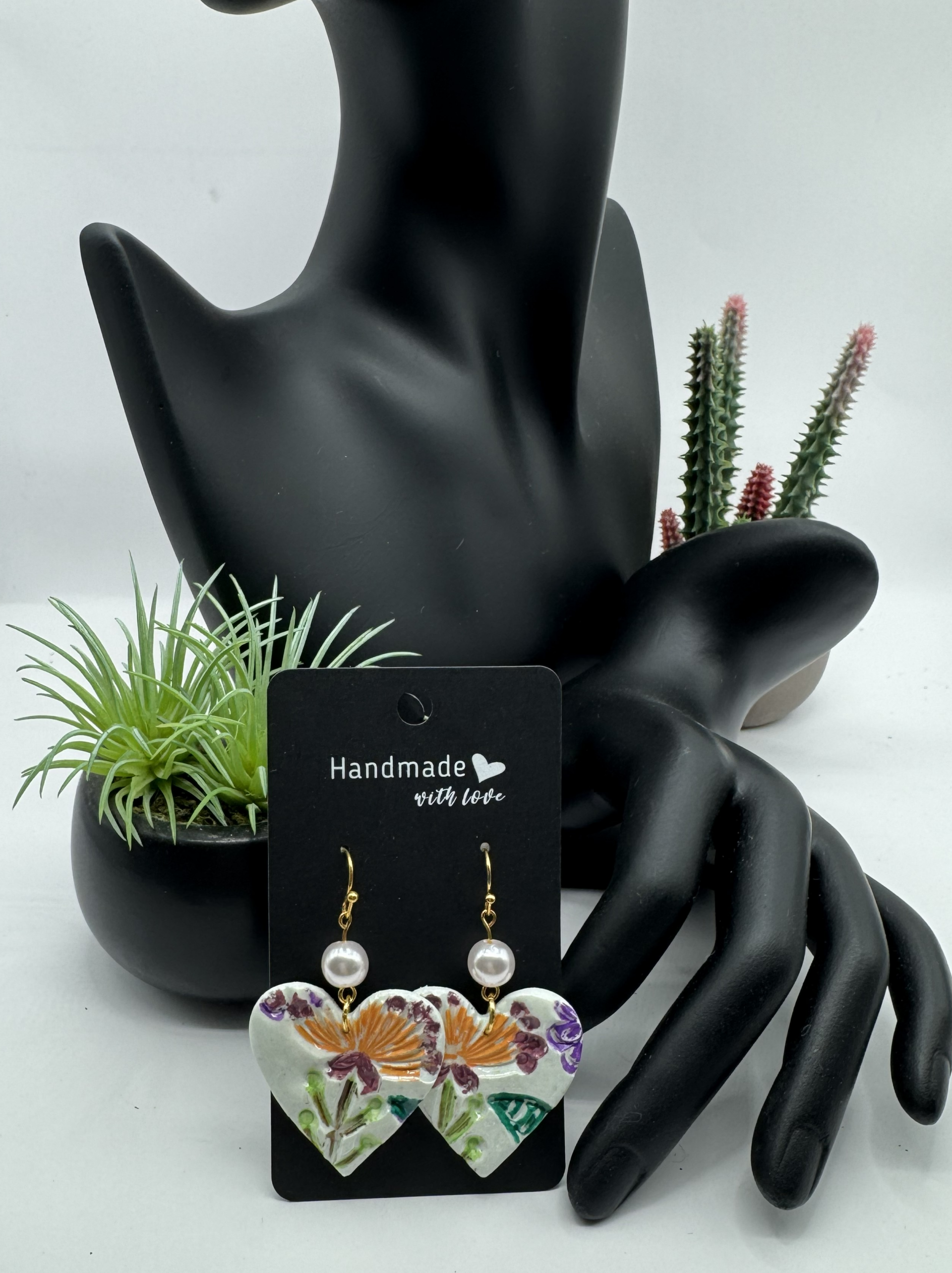 Set in gold-tone hardware, hand-painted hearts with pearl beads make this pair of earrings unique and beautiful. Made from polymer clay, they are comfortable and lightweight to wear every day.