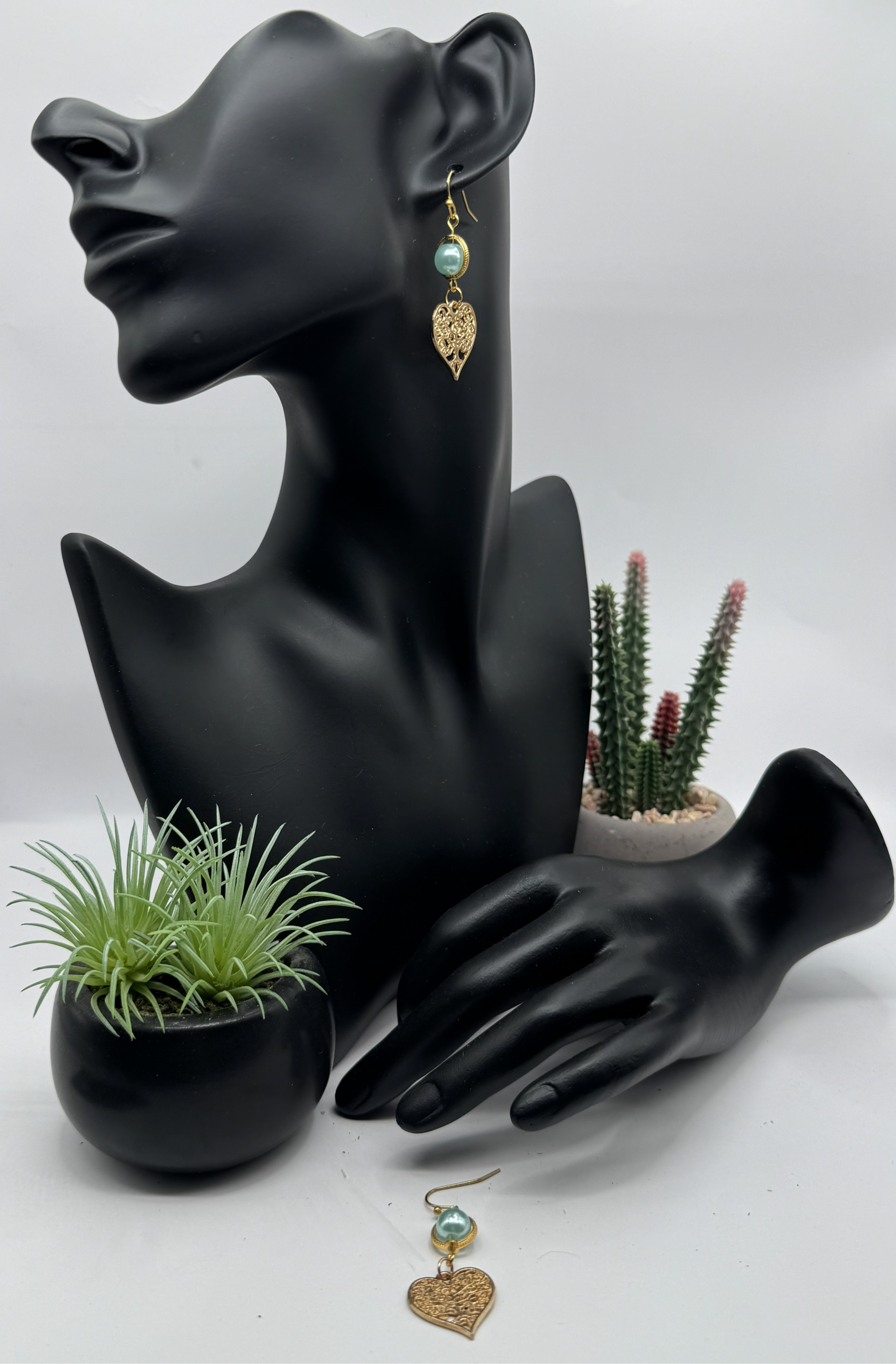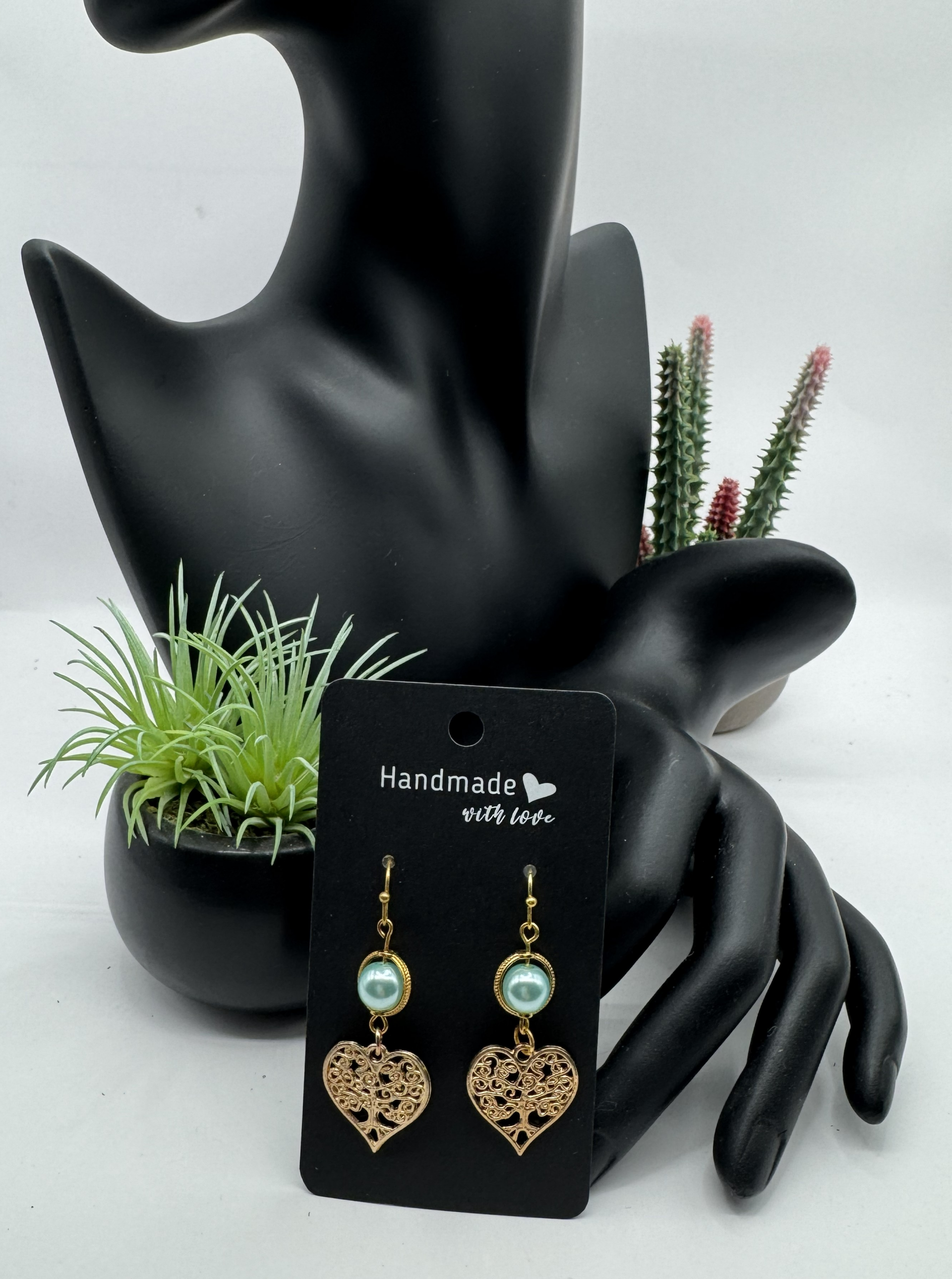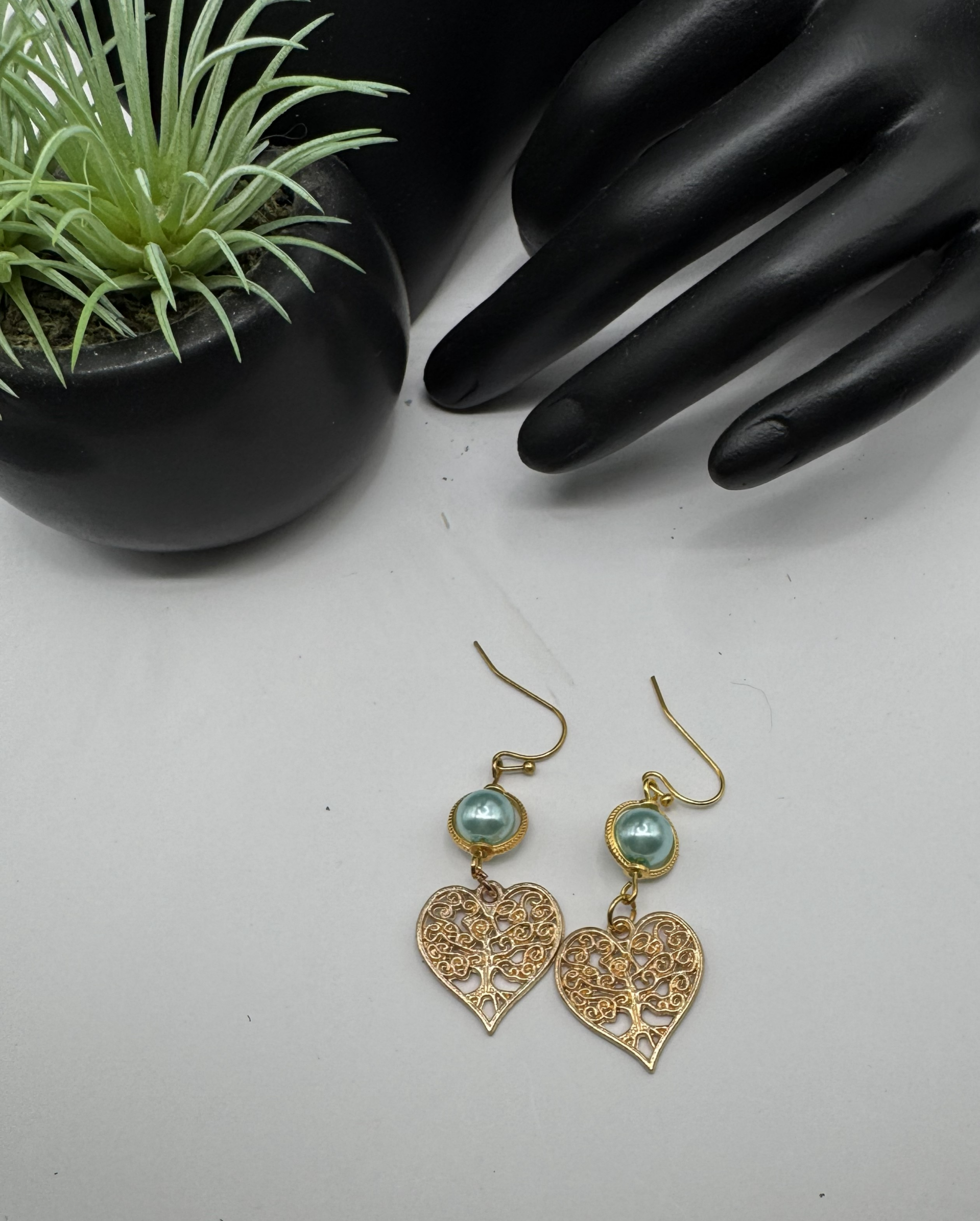 Set in gold-tone hardware, a heart with filigree and teal blue pearl bead enhancement adorns this comfortable pair of earrings.