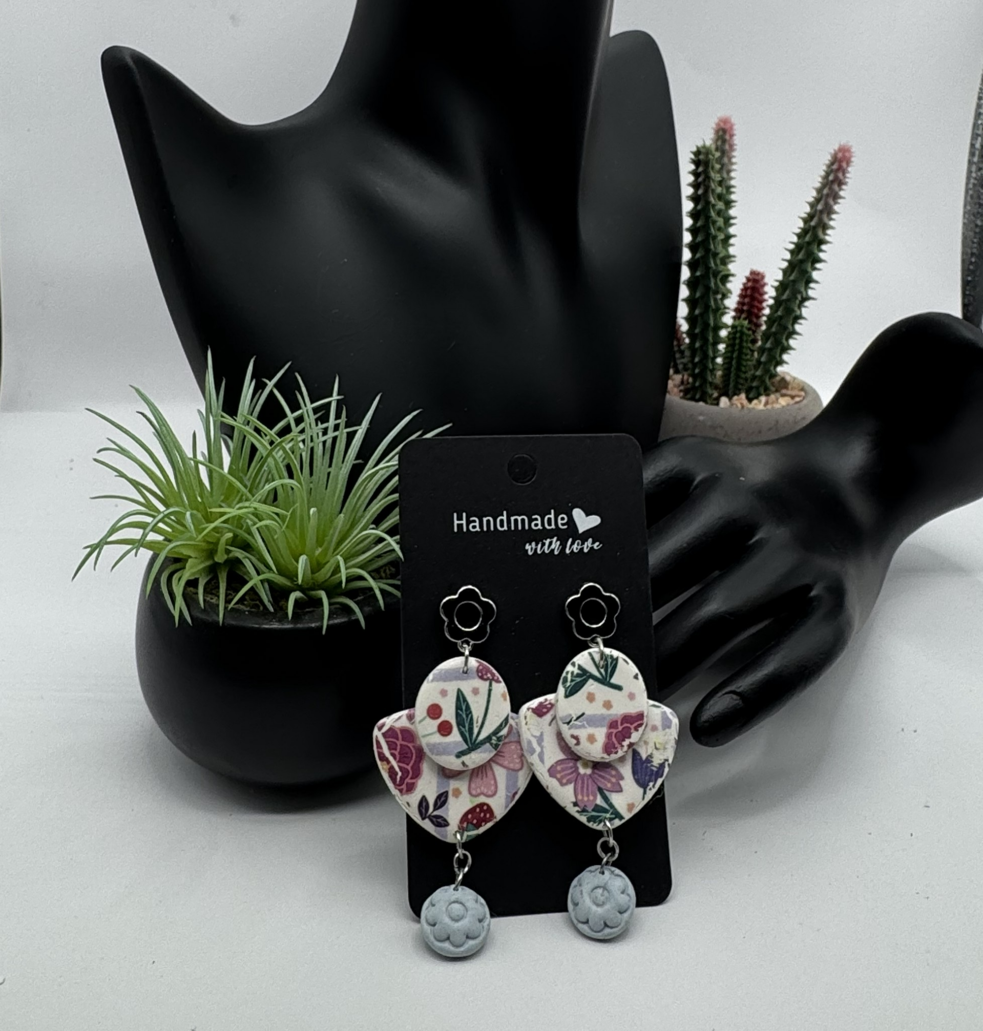 With a silver-tone flower-shaped post back, a triangle is overlapped by an oblong-shaped flower design in polymer clay. Enhanced with a round flower-stamped charm in periwinkle. Beautiful and unique piece to add to your wardrobe.