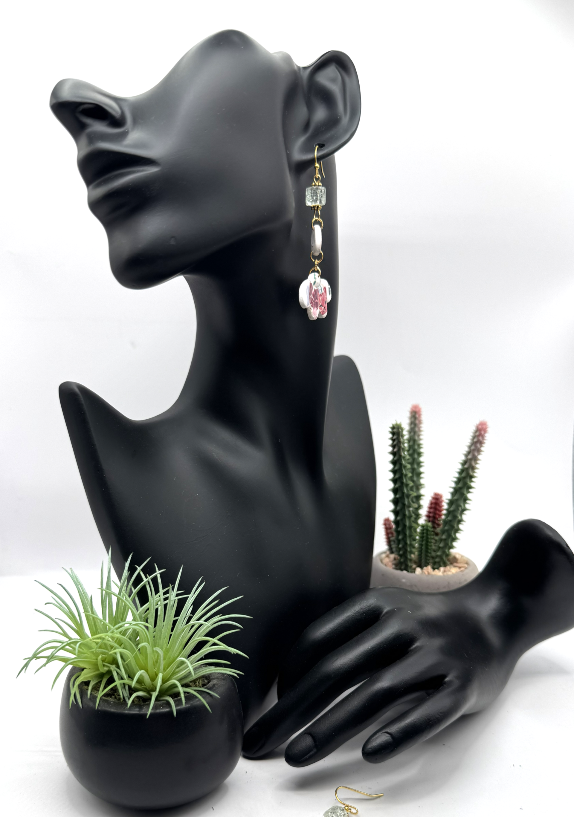 Fan-shaped floral polymer clay earrings with gold tone and a cube bead connector. If you love pink, the varying shades on this pair will surely match any outfit you choose.