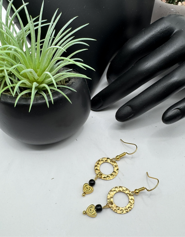Simple statement piece in gold tone hammered circle connector, and enhanced with black bead and gold heart charms.