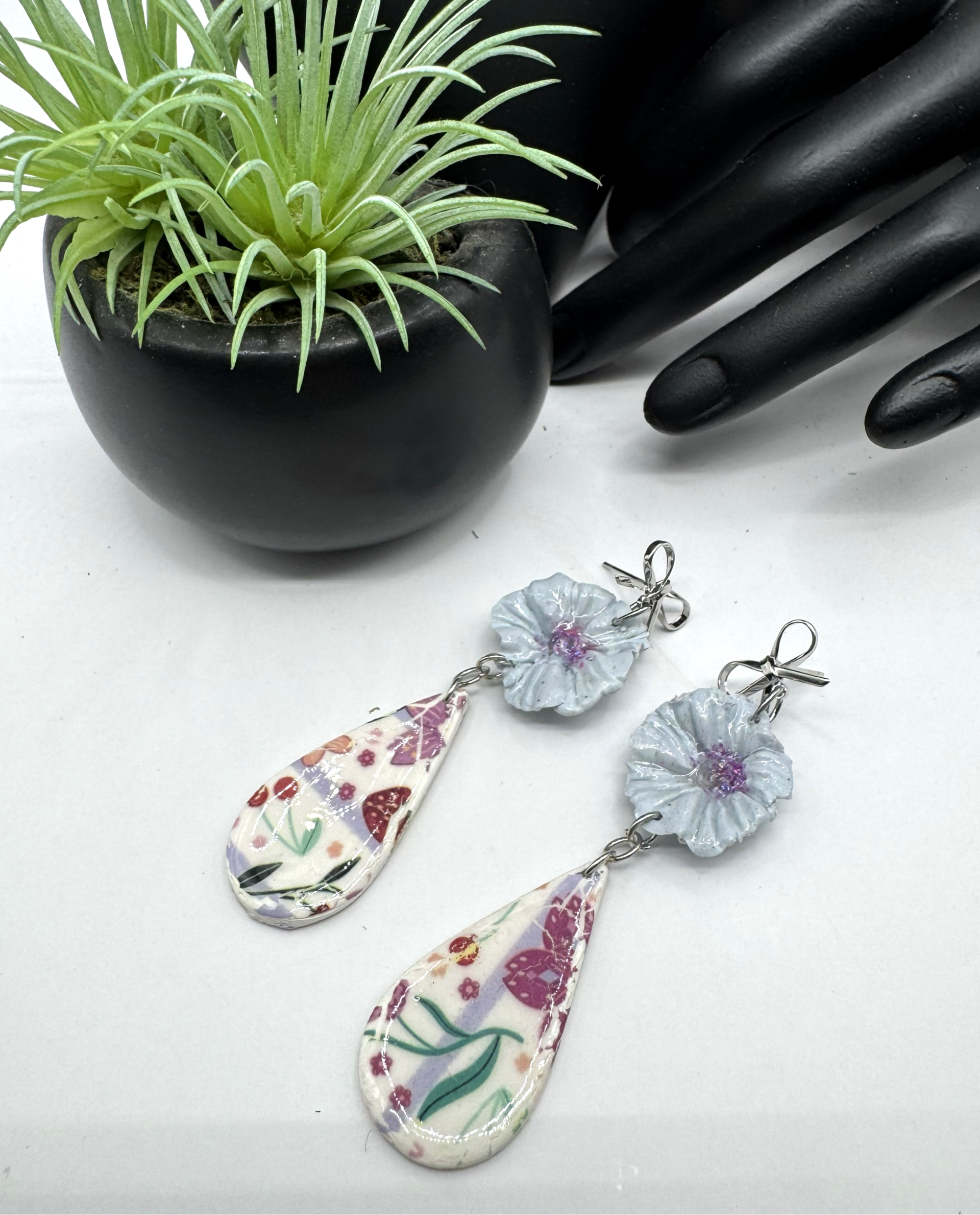 These unique earrings feature charming bow post backs, ensuring both style and comfort. The striking contrast between the vibrant periwinkle and the rich hues of pink creates a captivating focal point that will elevate any outfit. Make a bold statement and showcase your individuality with these exquisite earrings.. The contract between the periwinkle and the varying shades of pink makes this piece stand out.