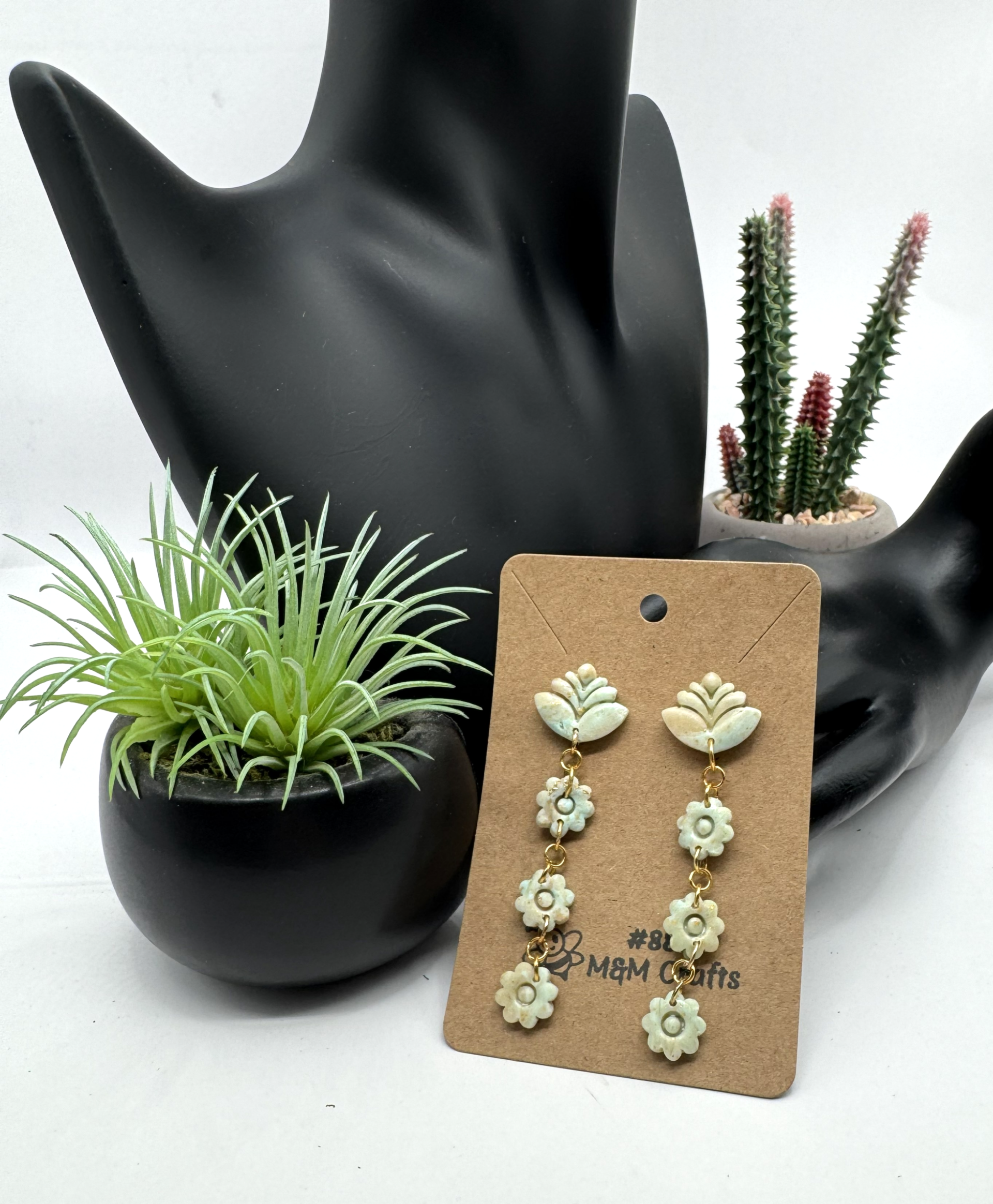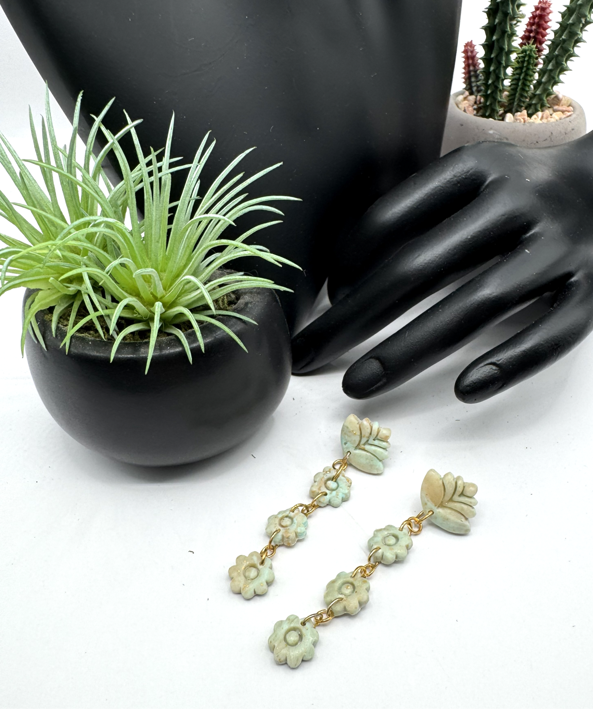 In gold tone hardware, greenish/beige lotus with 3 round string earrings on a post back. The colors are muted and subtle on this beautiful pair of earrings.