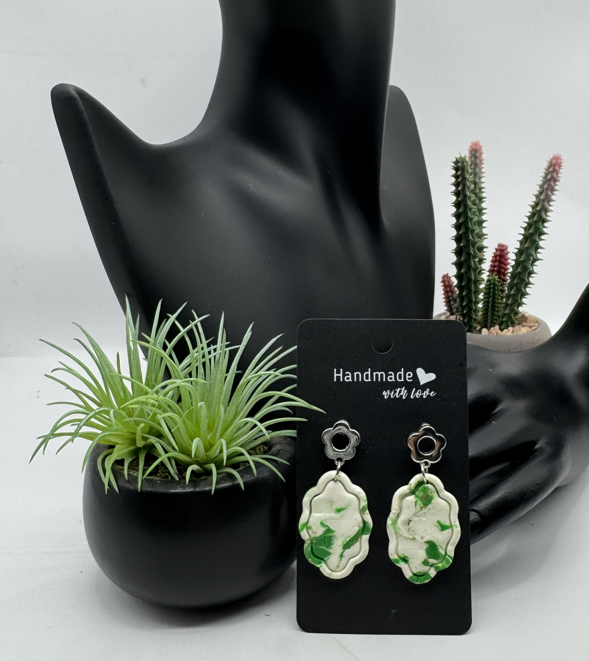 In a simple setting with a silver-tone flower-shaped post back, these earrings are stunning in a green-and-cream polymer clay color combination. For everyday wear and for the holidays, green.