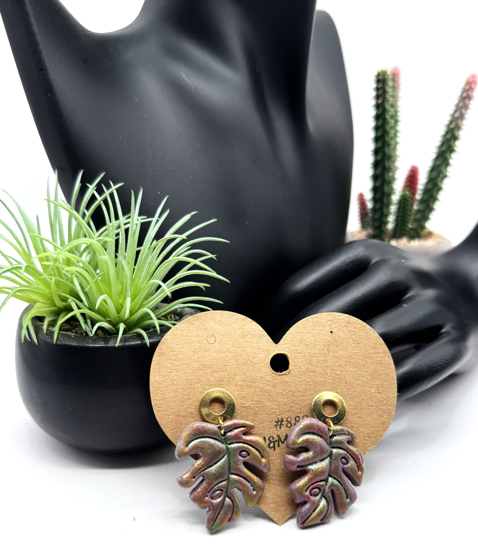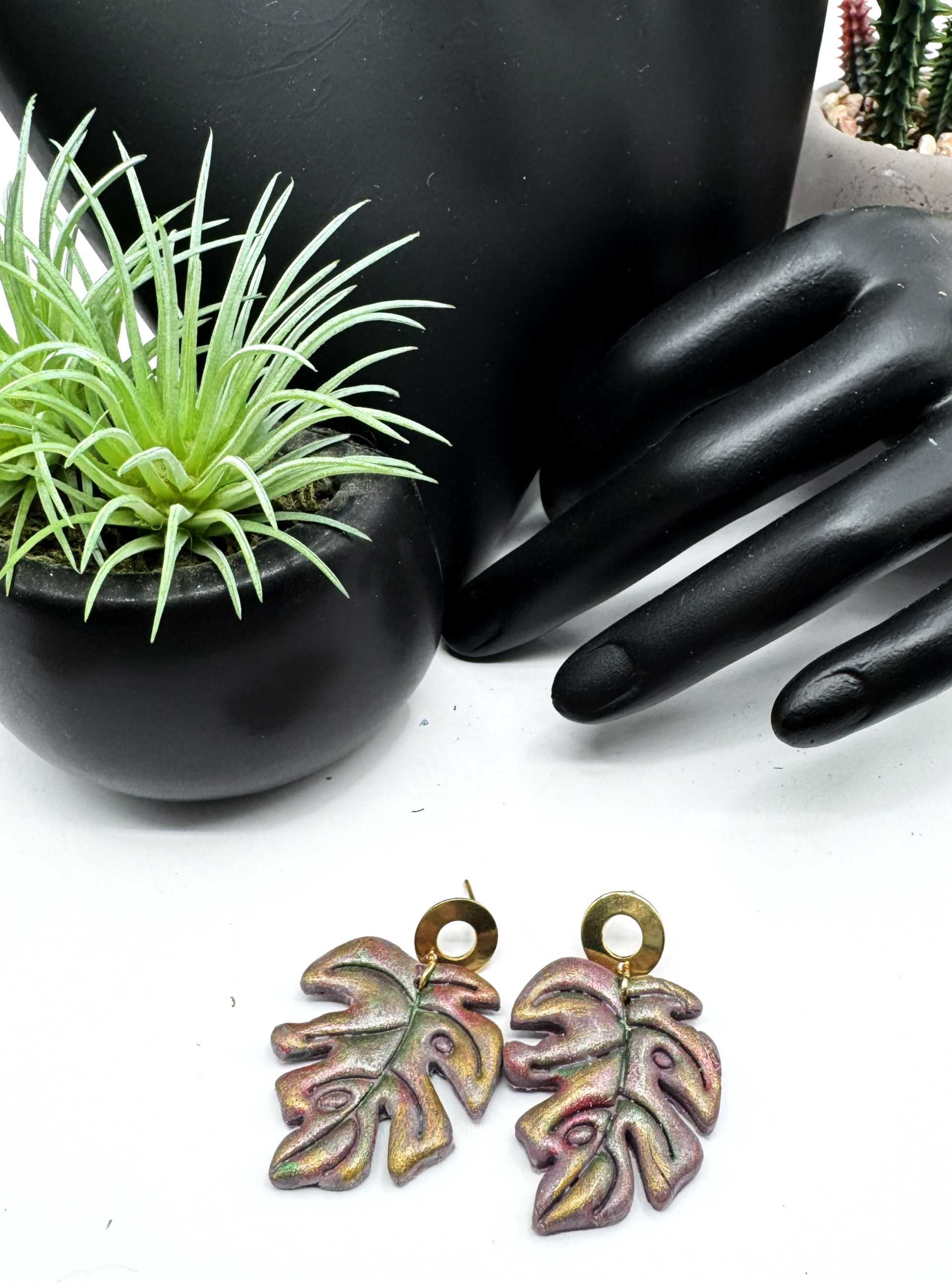 Nothing is more beautiful than Monstera leaves made of polymer clay, showcasing a kaleidoscope of autumn colors enhanced with gold-tone, open post-back earrings. The colors on this match just about anything in your wardrobe. Truly a versatile pair to have in your collection.