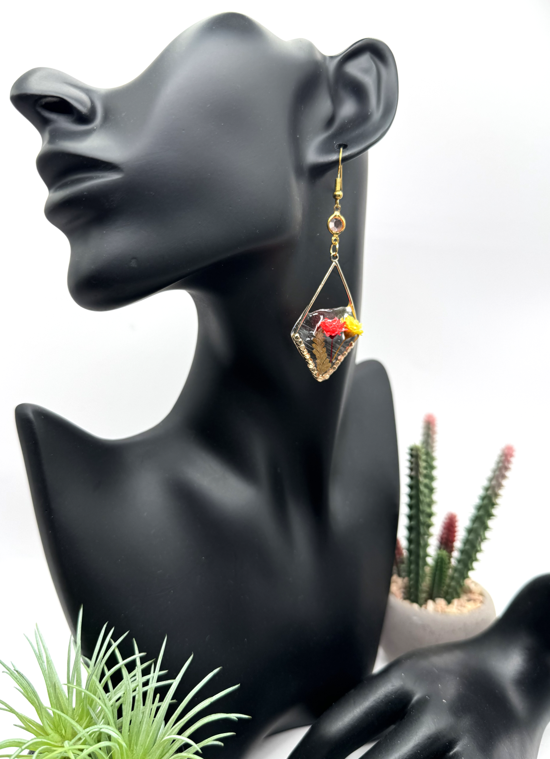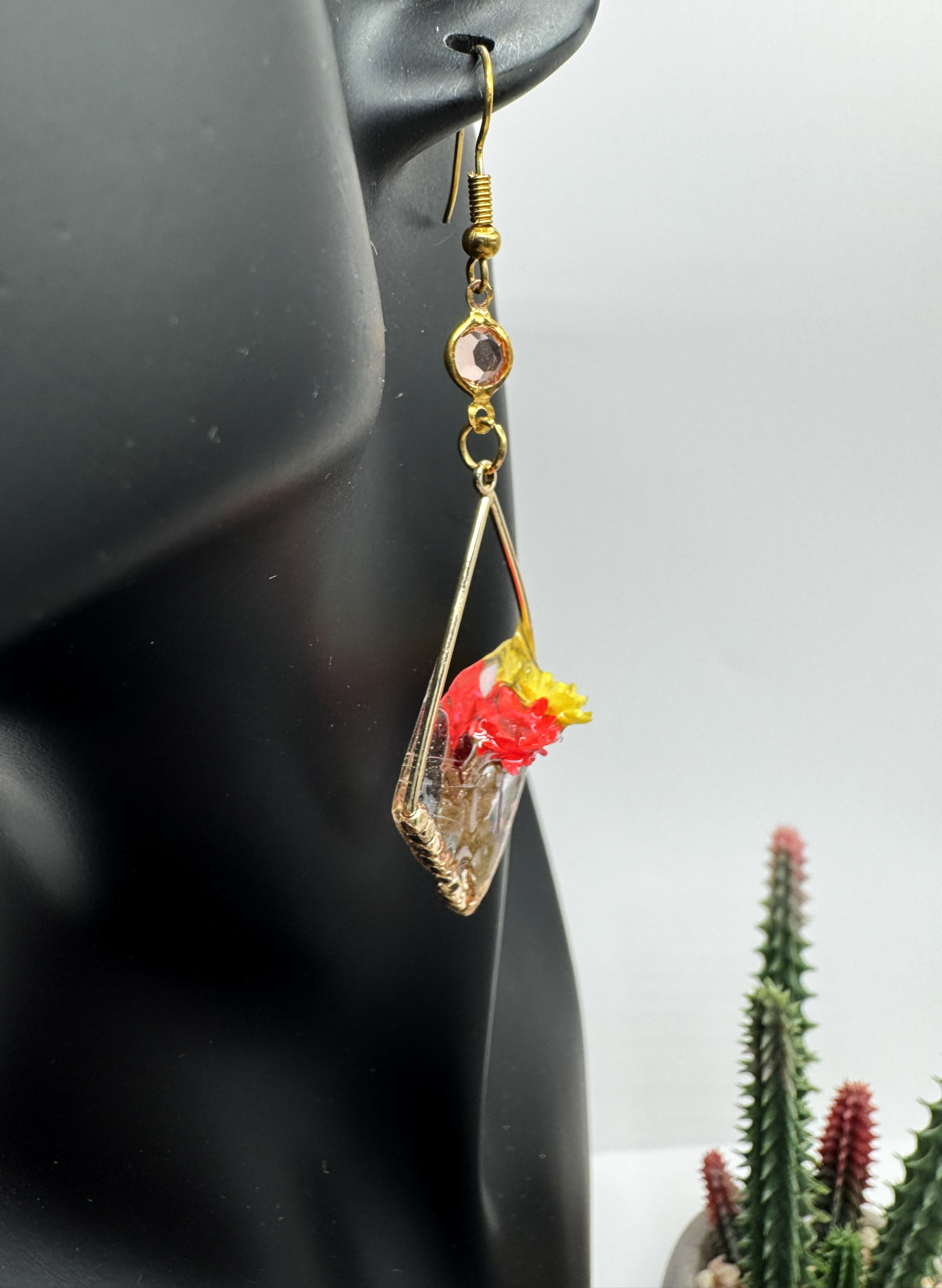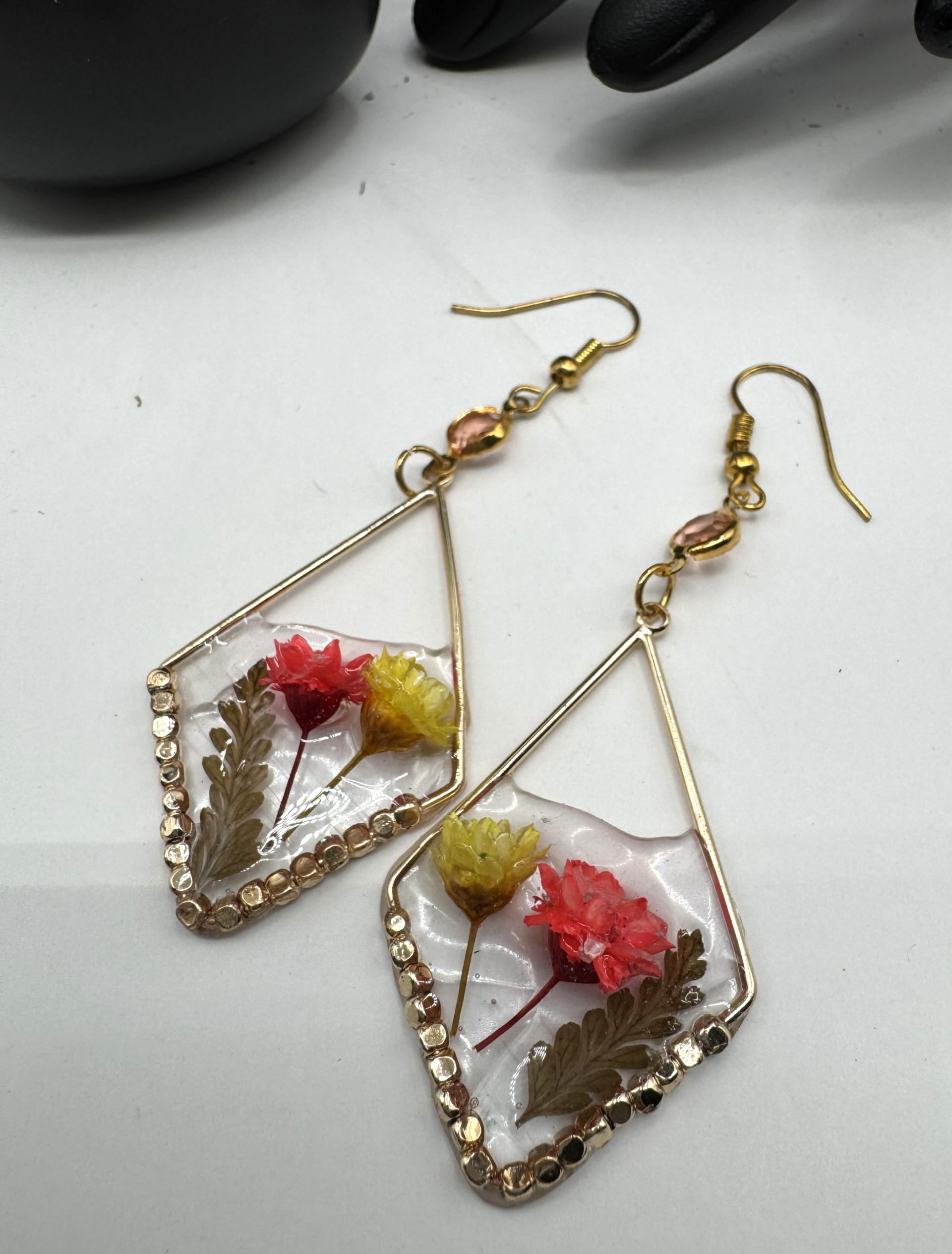 This pair is one of my favorites! Featuring gold-tone hardware, the earrings showcase dried flowers partially sealed in resin, creating a three-dimensional effect with some flowers not fully immersed. The stunning yellow and fluorescent peach/orange flowers add vibrant colors, giving any outfit an uplifting touch.