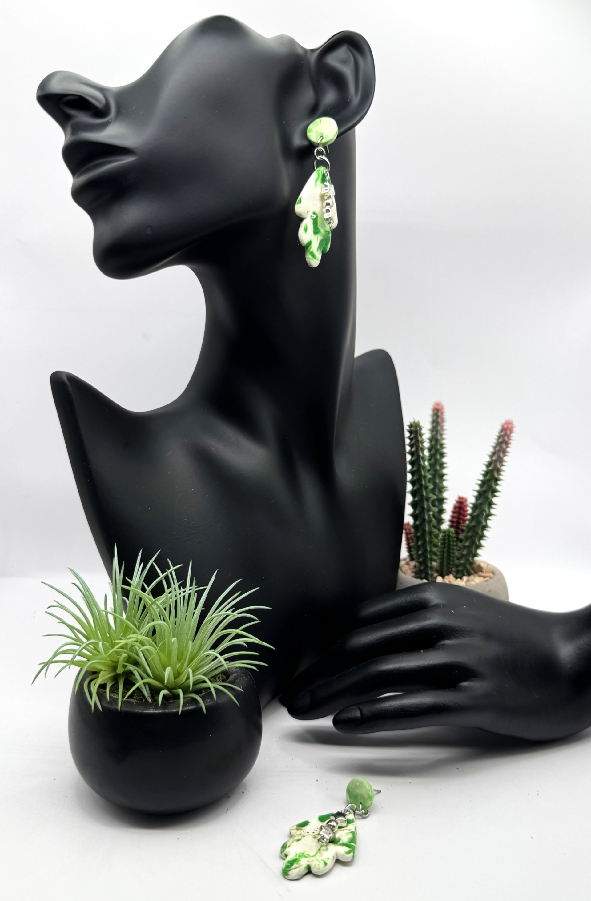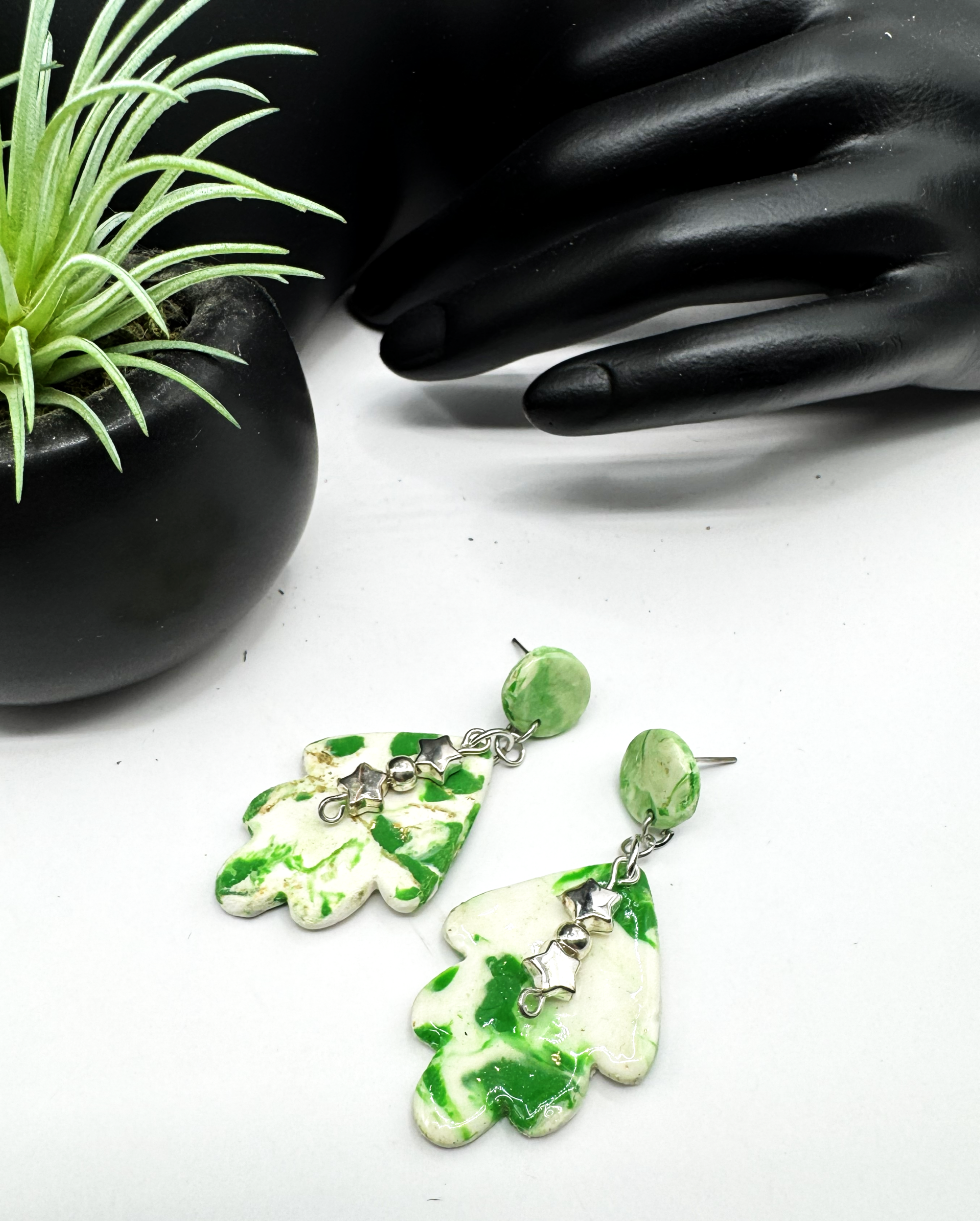 These polymer clay earrings feature an interesting design resembling an upside-down tree, combining shades of green and cream with silver-tone hardware and charms. They have round button posts that make them lightweight and comfortable to wear. Although they aren't specifically made for the holidays, they can easily complement your Christmas sweater.