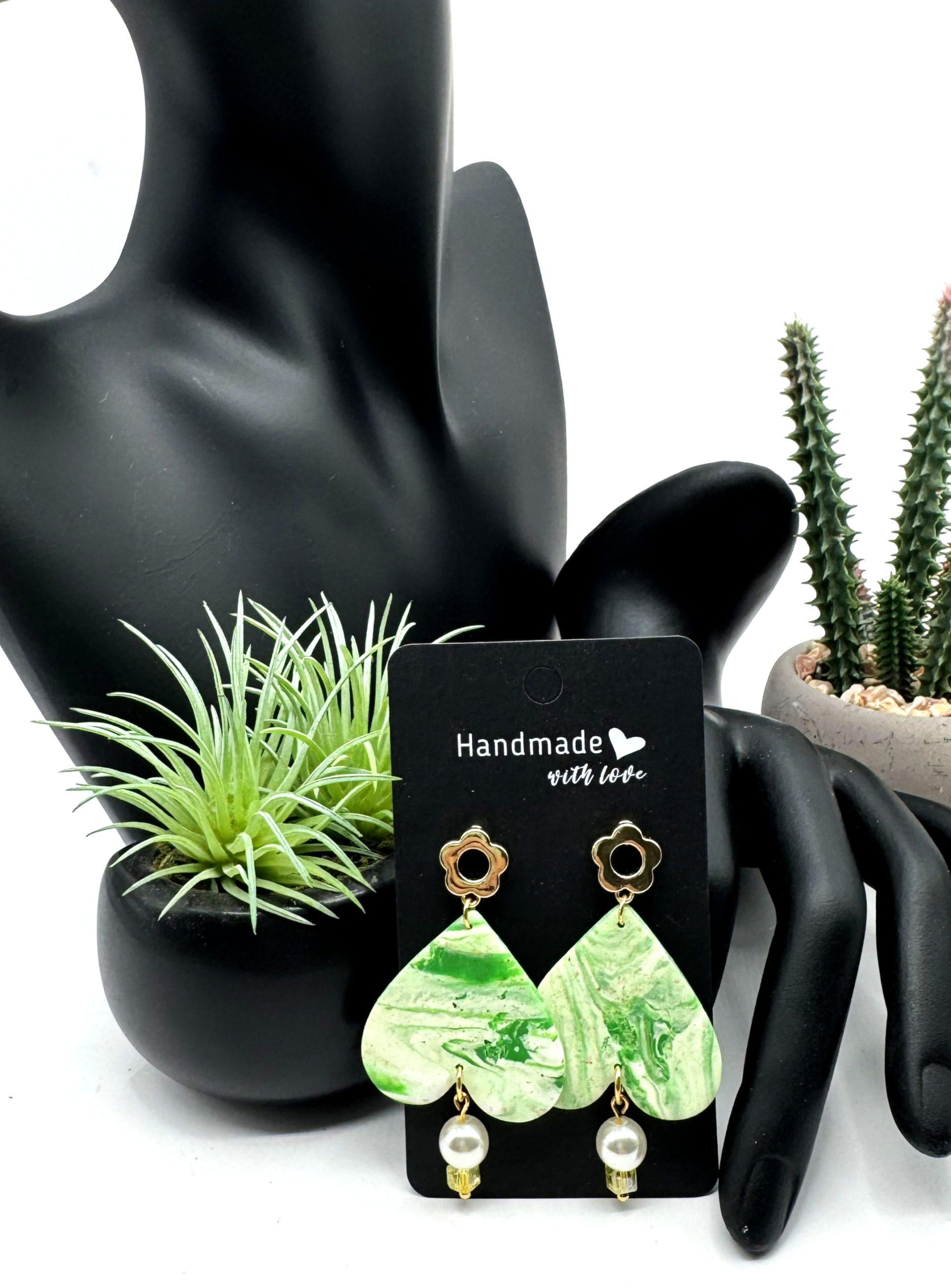 Is it a heart or a spade? That is the question. This pair of earrings features a spade-like design, enhanced with pearl-like beads and yellow cube crystals. Set in gold tone, these earrings feature clover-shaped post backs. The combination of green and cream polymer clay creates beautiful color patterns, making this pair unique and sophisticated.