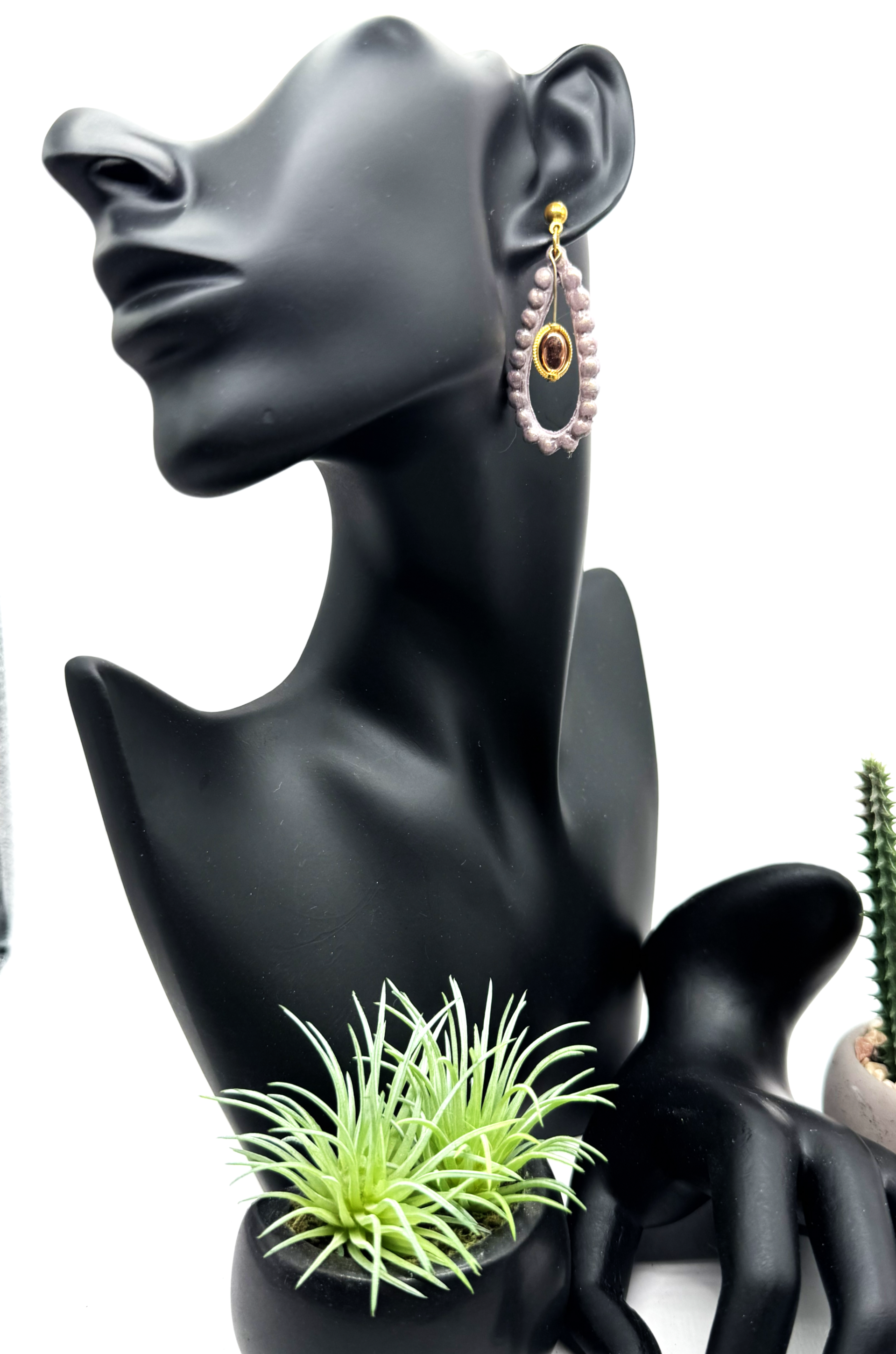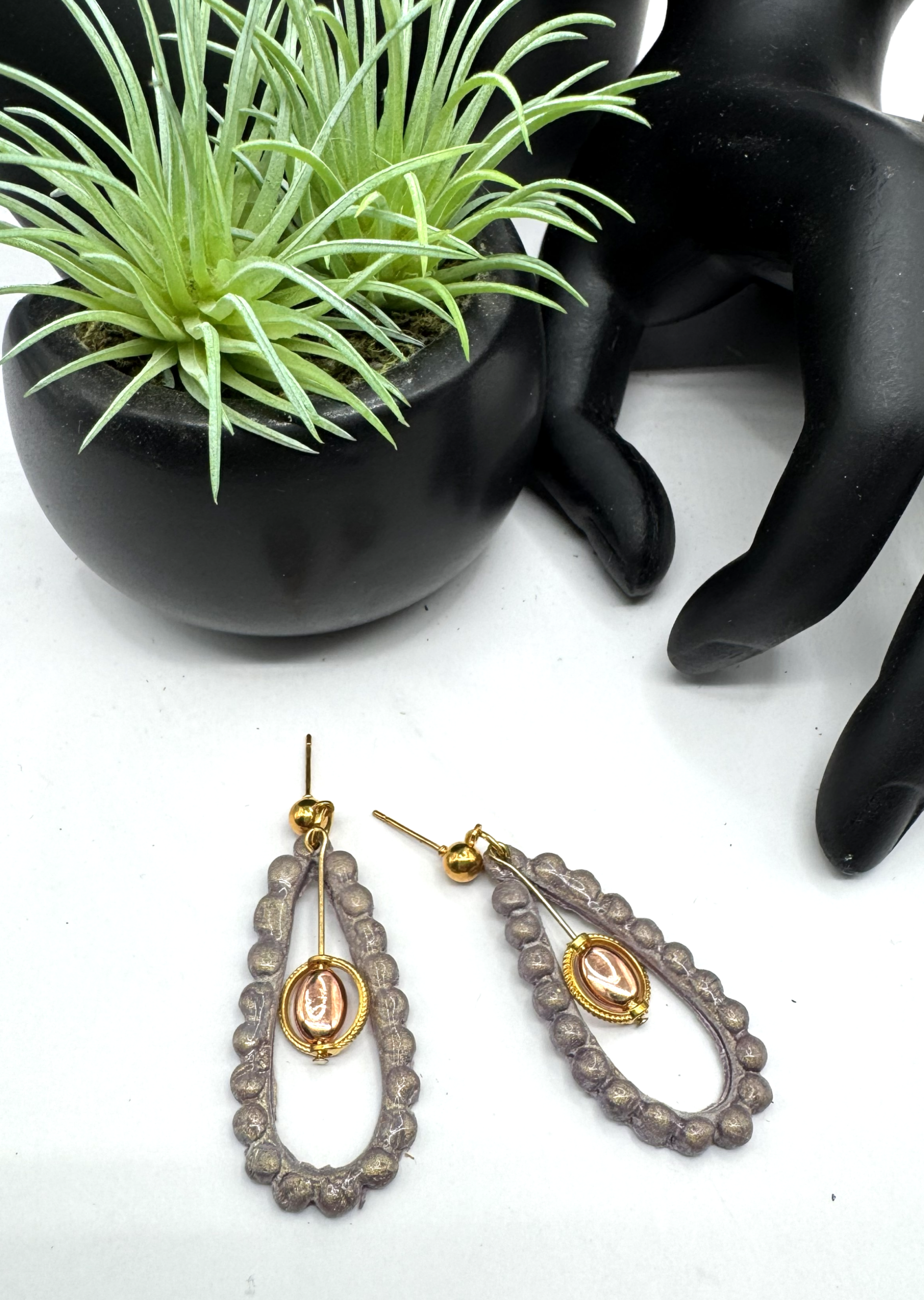 Love this lightweight pair of polymer clay in the neutral taupe color with beads and enhanced with gold and rose-gold hardware and charms.