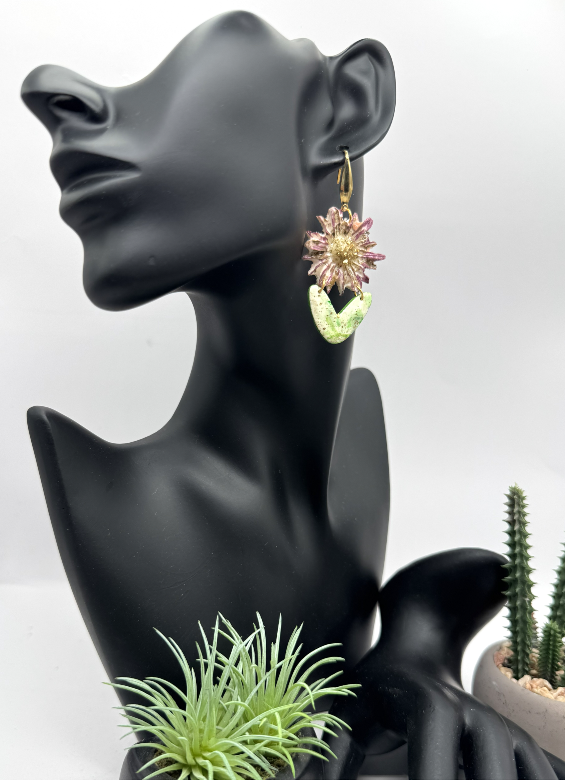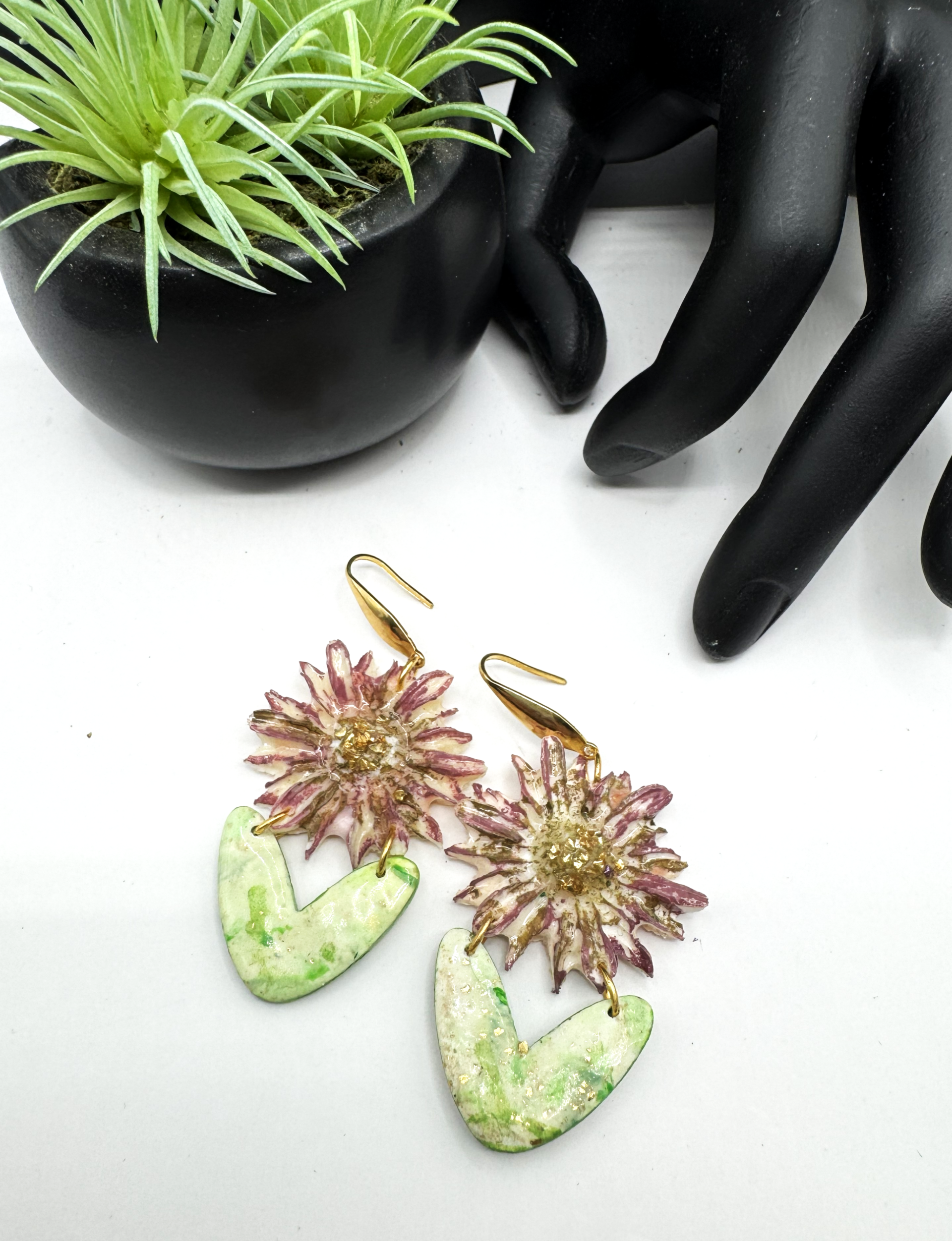 These flower earrings are made from polymer clay and are designed to be two-dimensional with gold hardware. The flowers feature reddish-purple hues, while the leaves are in shades of green, cream, and gold. These fun earrings are a versatile addition to your collection, suitable for all seasons and occasions.
