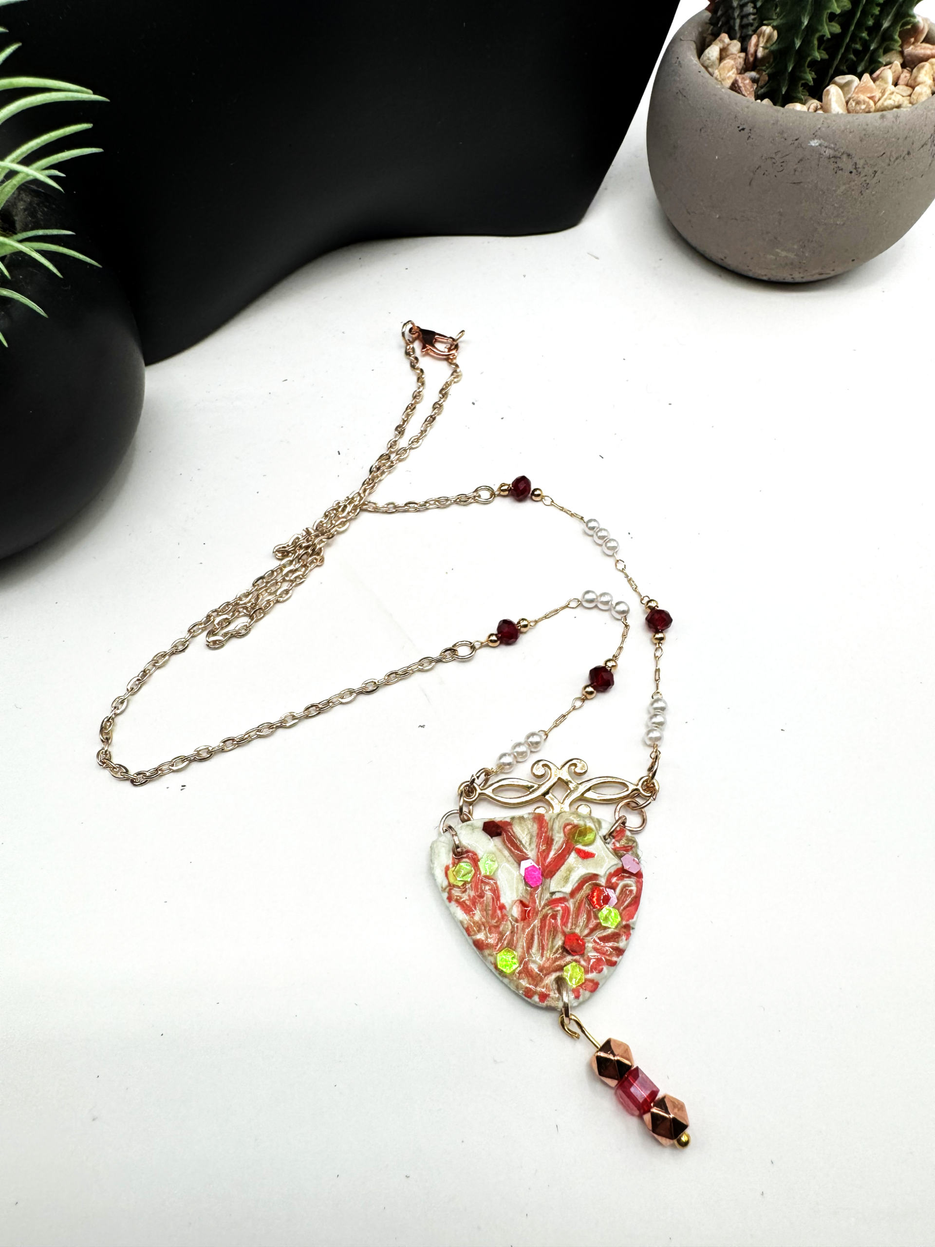 This necklace features a gold-tone beaded chain supporting a hand-painted polymer clay pendant with a scroll connector and crystal charms. The necklace measures 22 inches in length and includes a 2-inch extension. It's a stunning statement piece that can transition effortlessly from casual daytime wear to more elaborate evening occasions.
