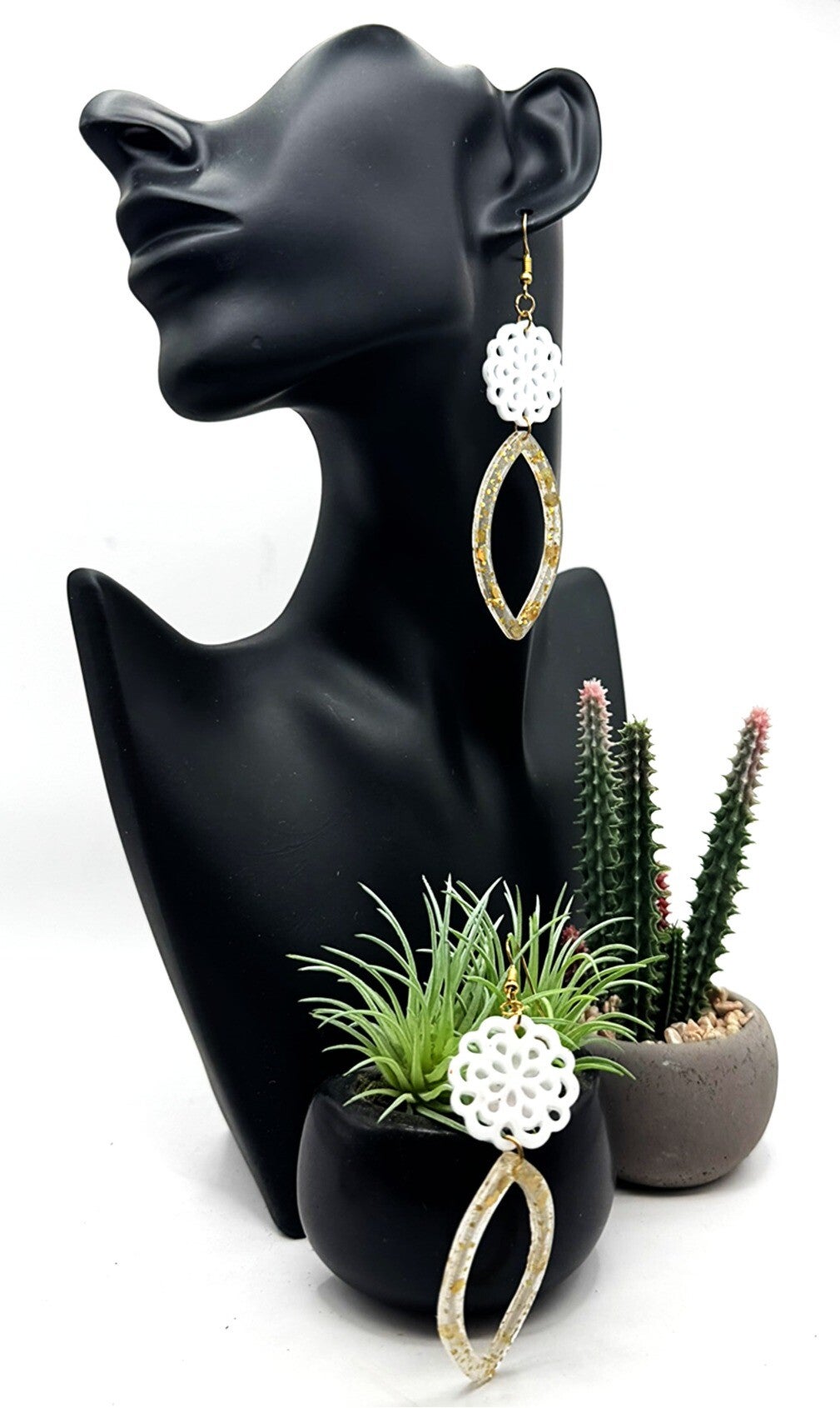 I'm so excited to share that this pair was inspired by stunning shell earrings I found in Hawaii! I adapted that beautiful concept using resin to create pieces that are not only eye-catching but also durable, unlike delicate natural shells. The blend of white and gold gives them a lovely, versatile flair that complements almost any outfit. They're intricate yet lightweight, making them a joy to wear every day!